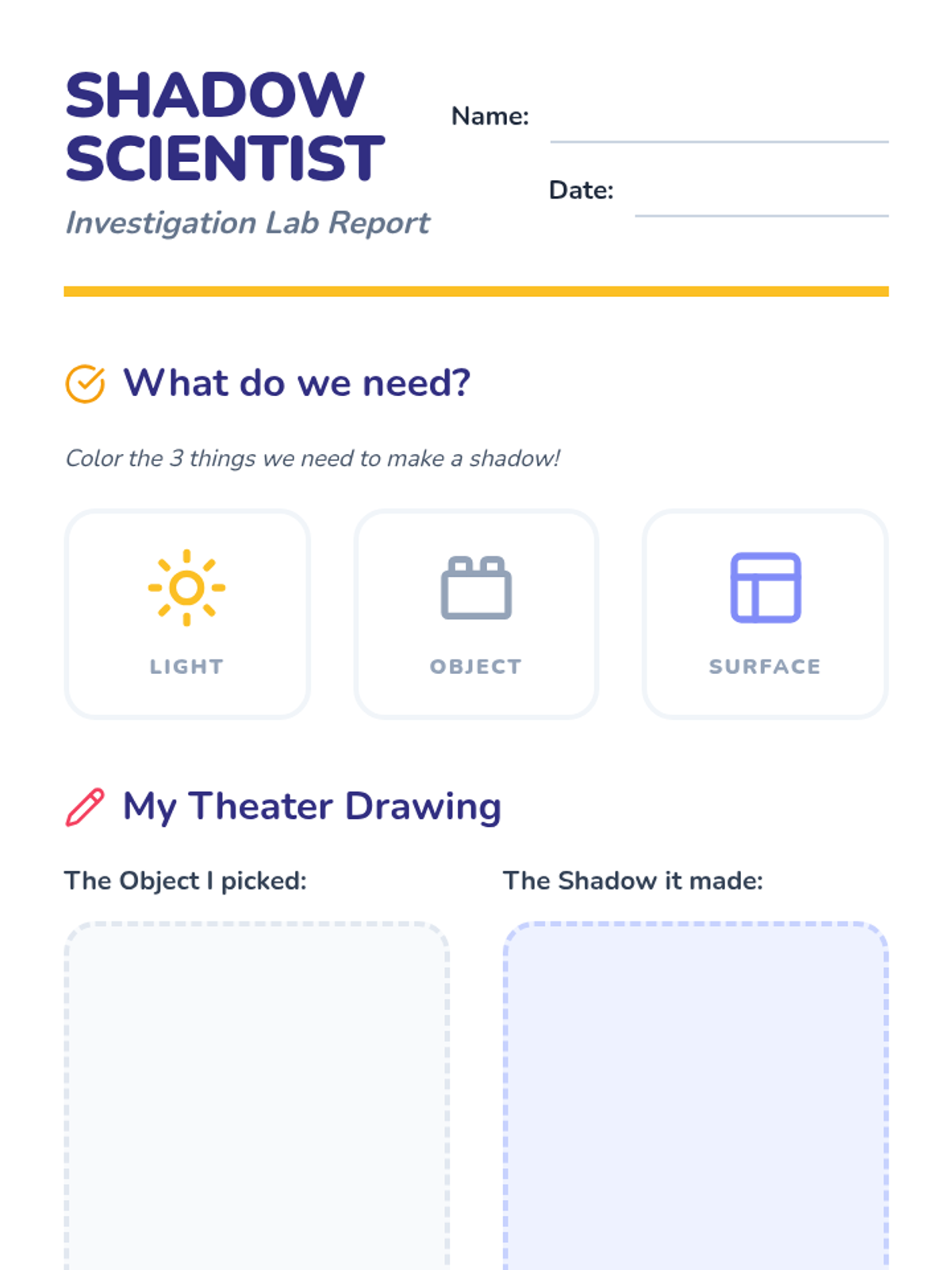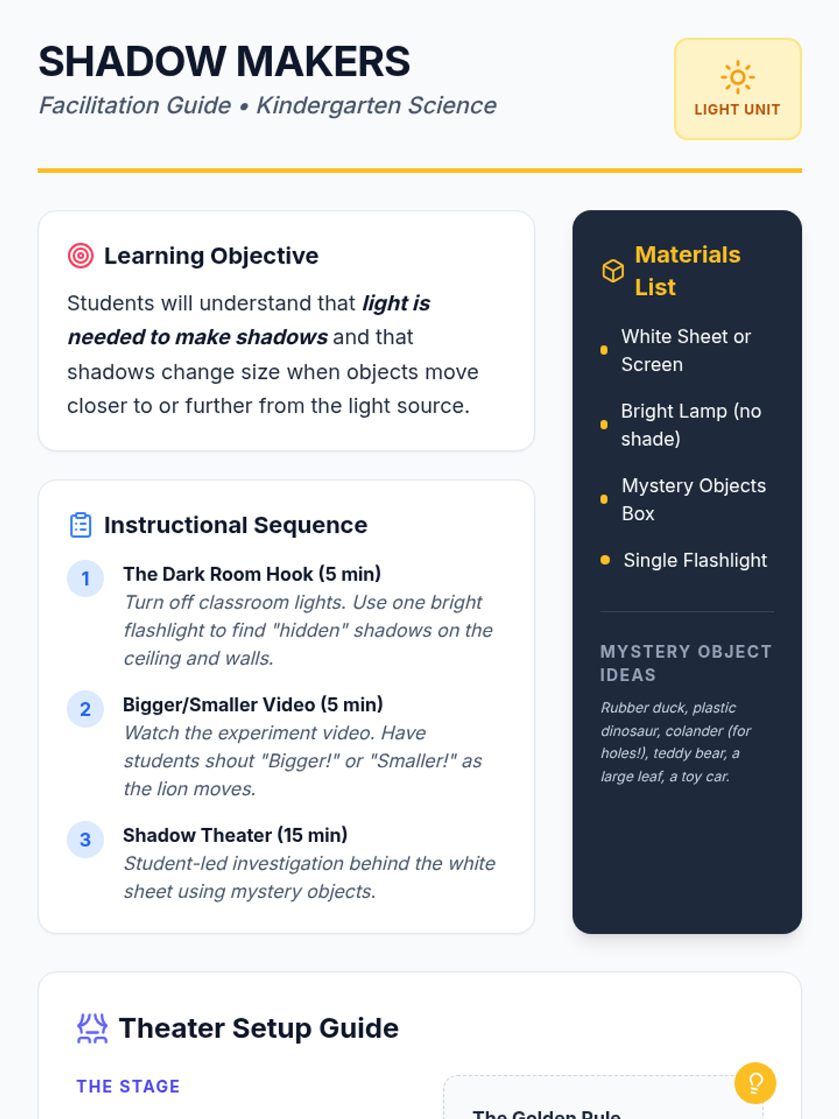 A hands-on introduction to light and shadows for Kindergarteners. Students will explore how light creates shadows and how moving objects changes their size through a "Shadow Theater" activity.