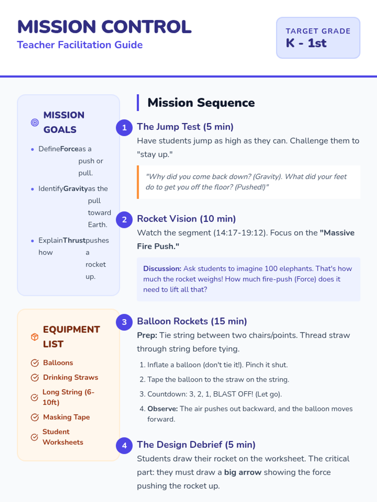 Students will explore the concept of force through the lens of rockets, understanding how a massive push (thrust) overcomes gravity. The lesson includes a video segment, a hands-on balloon rocket activity, and a drawing reflection.