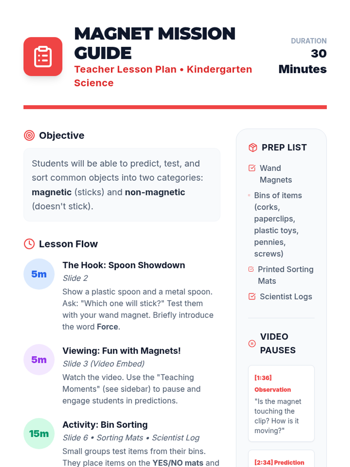 A hands-on Kindergarten science lesson introducing magnets through sorting and exploration. Students predict and test which common objects are attracted to magnets, discovering that only certain metals (iron) stick.