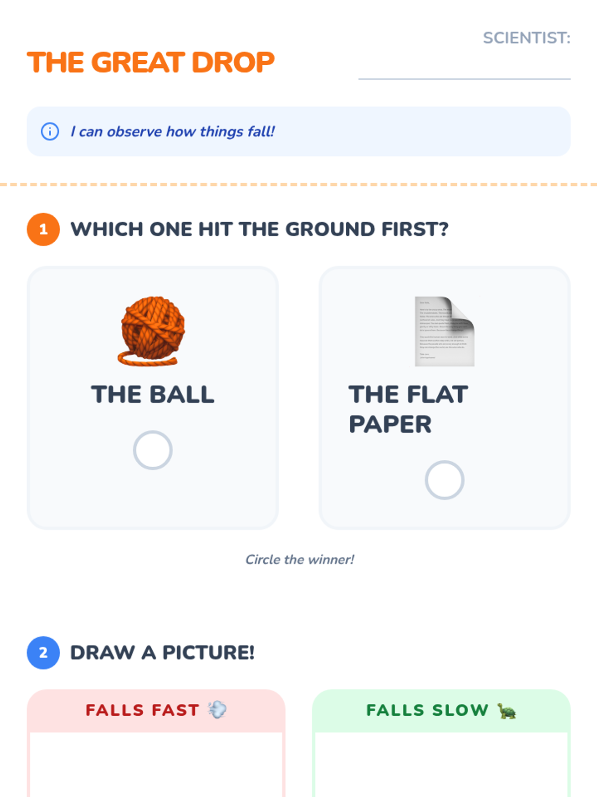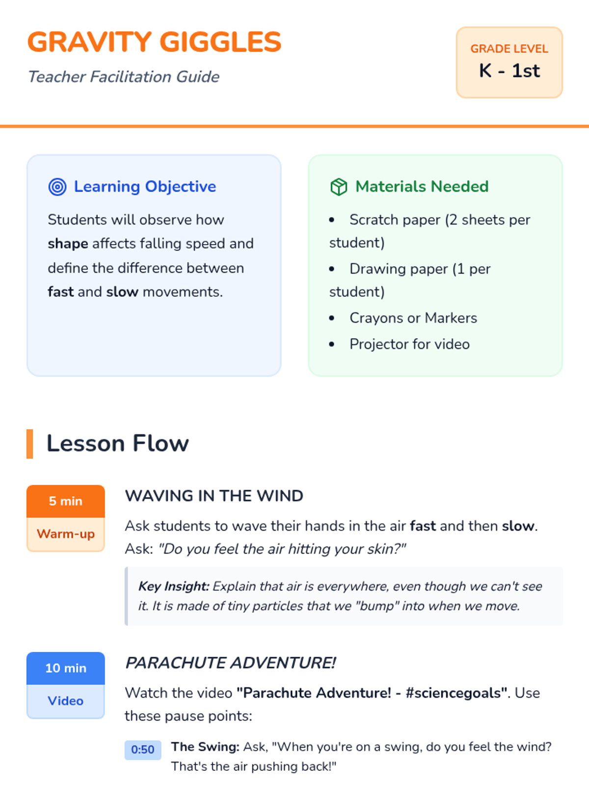 A Kindergarten and 1st Grade lesson exploring gravity and air resistance. Students investigate how the shape of an object changes its falling speed through a hands-on paper drop experiment and a video about parachutes.