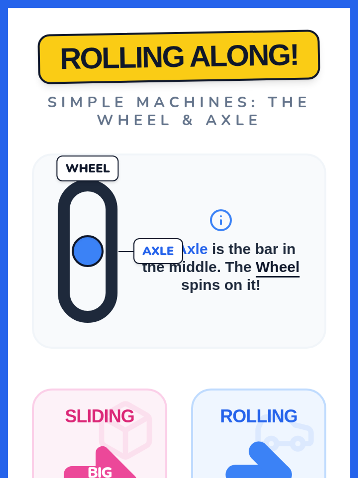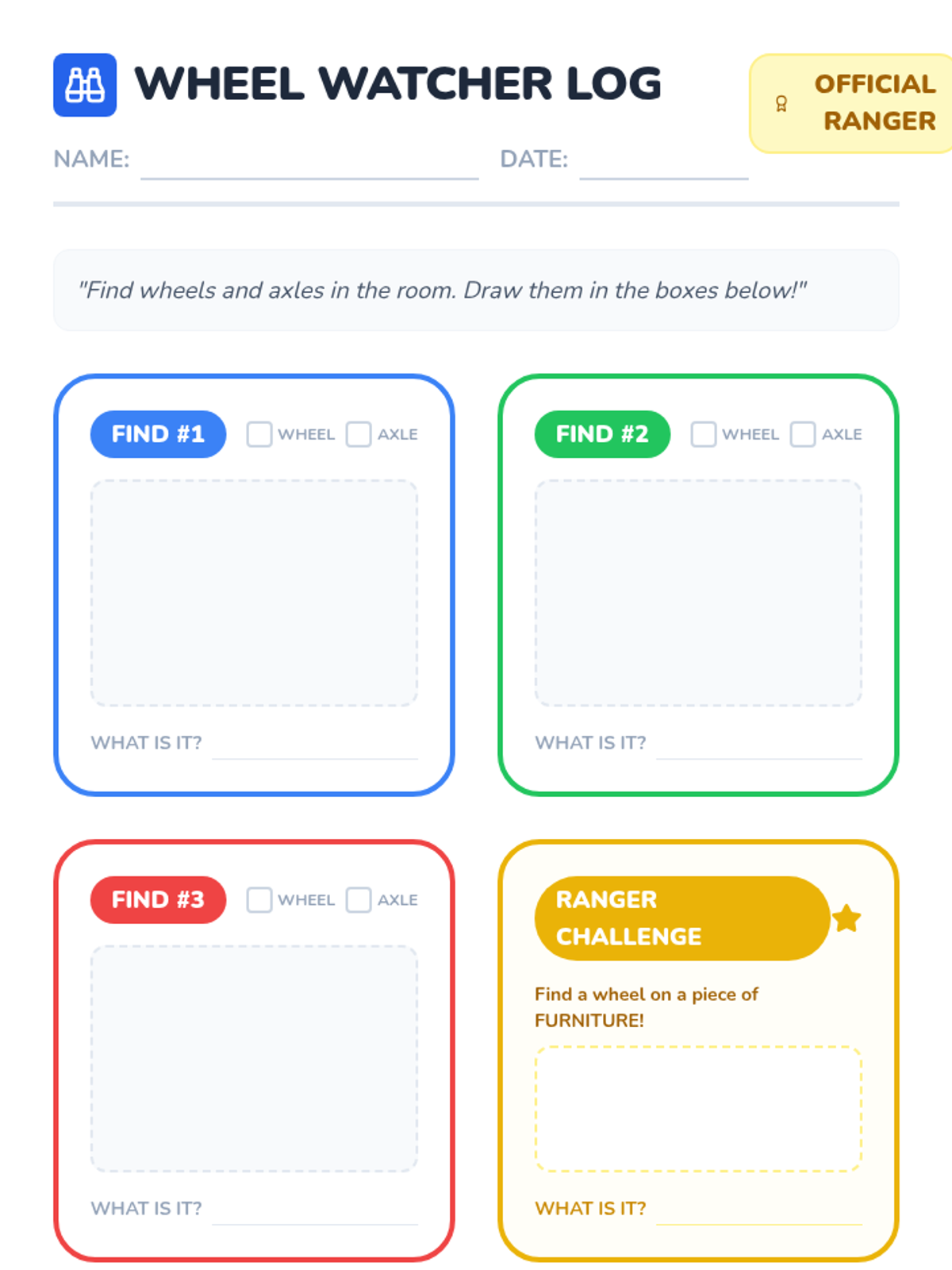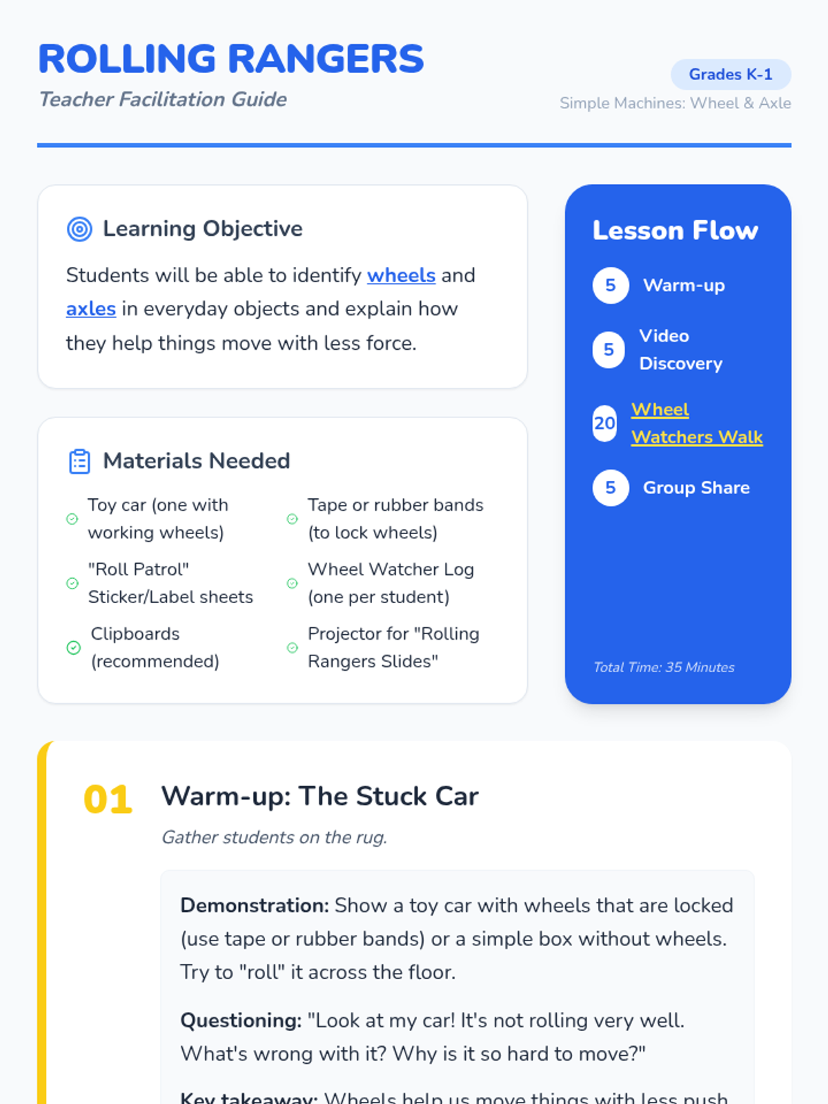 A hands-on introductory lesson for Kindergarten and 1st Grade students to identify wheels and axles in their environment through observation and active exploration.