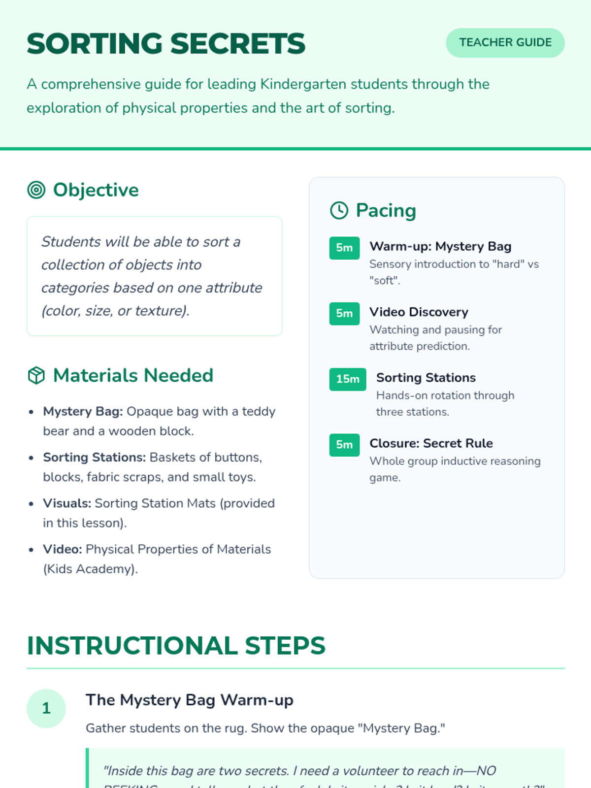 A hands-on introduction to sorting by attributes like color, size, and texture for Kindergarten students, featuring a 'Mystery Bag' warm-up and interactive sorting stations.