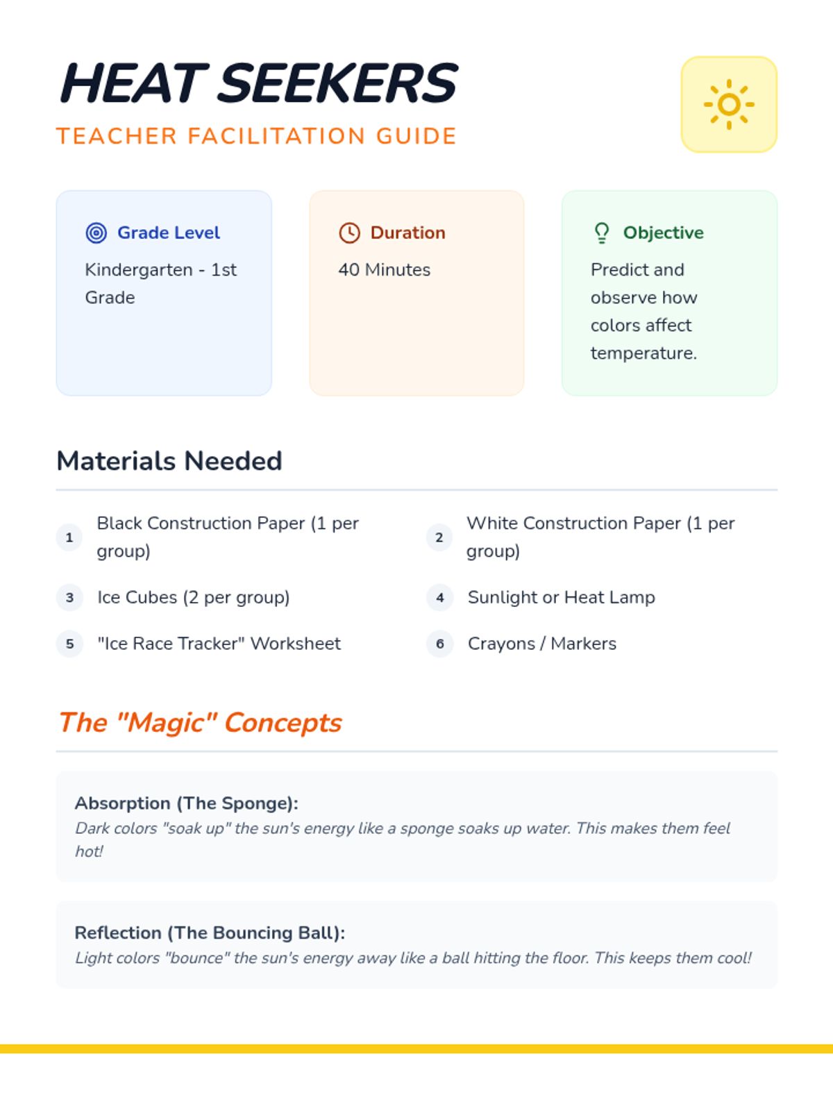 A Kindergarten - 1st Grade lesson exploring how colors absorb heat using a fun ice-melting experiment and a 'Save the Snowman' theme. Students learn about absorption and reflection through hands-on play and visual analogies.
