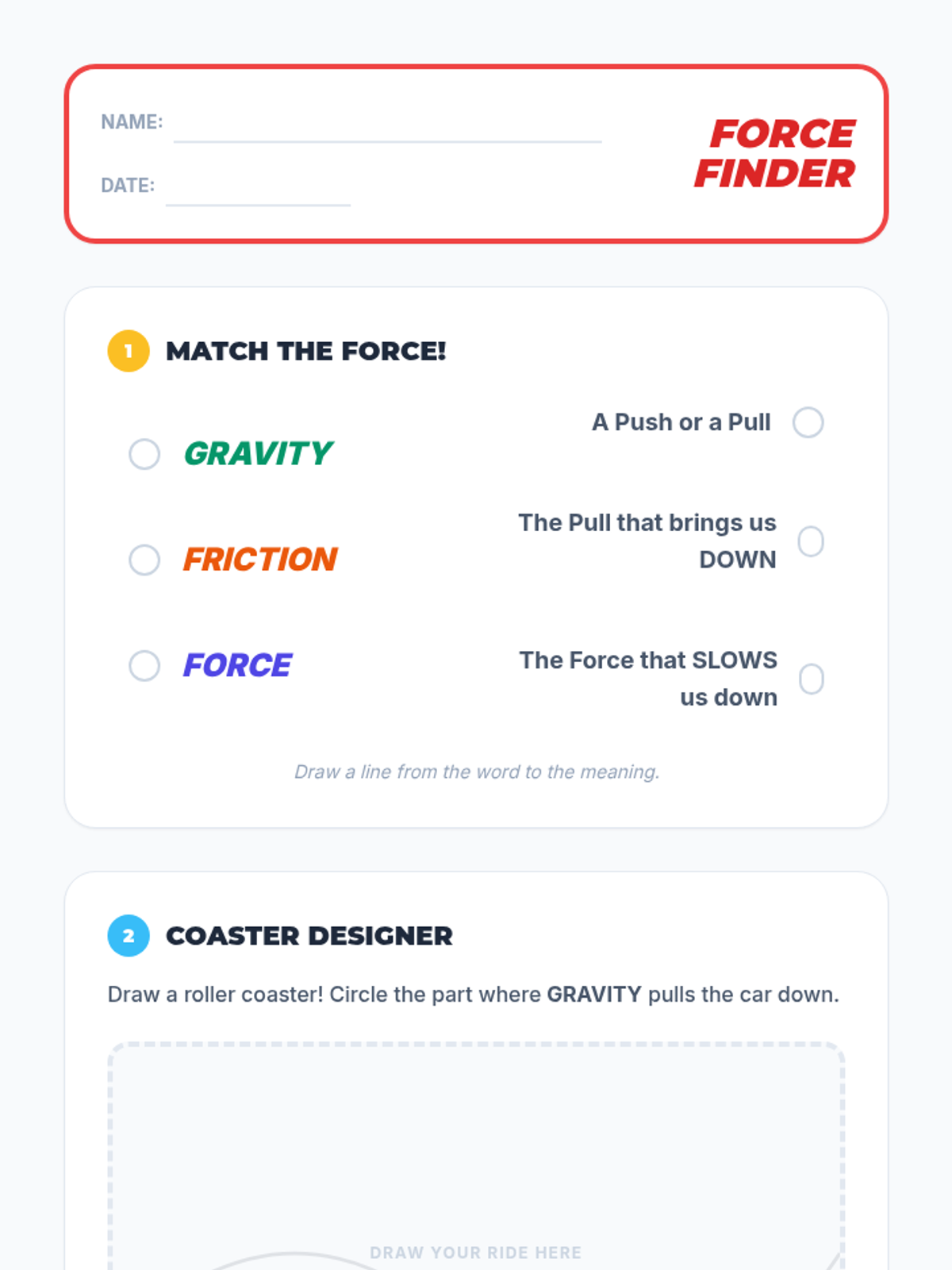 A Kindergarten to 1st-grade lesson introducing the concept of forces through a fairground theme, featuring a hands-on 'Force Hunt' and a roller coaster video.