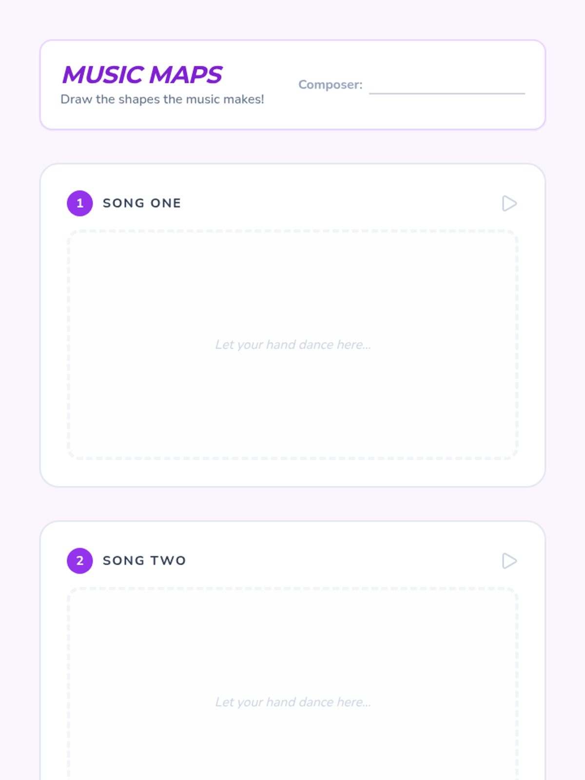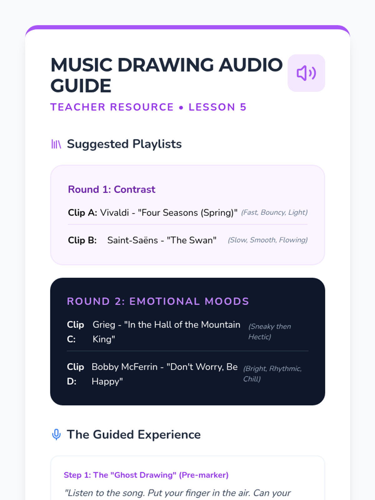 Students translate musical rhythms and moods into lines, shapes, and colors, connecting auditory input to visual creativity.