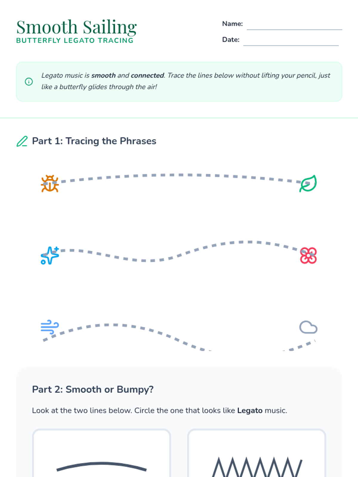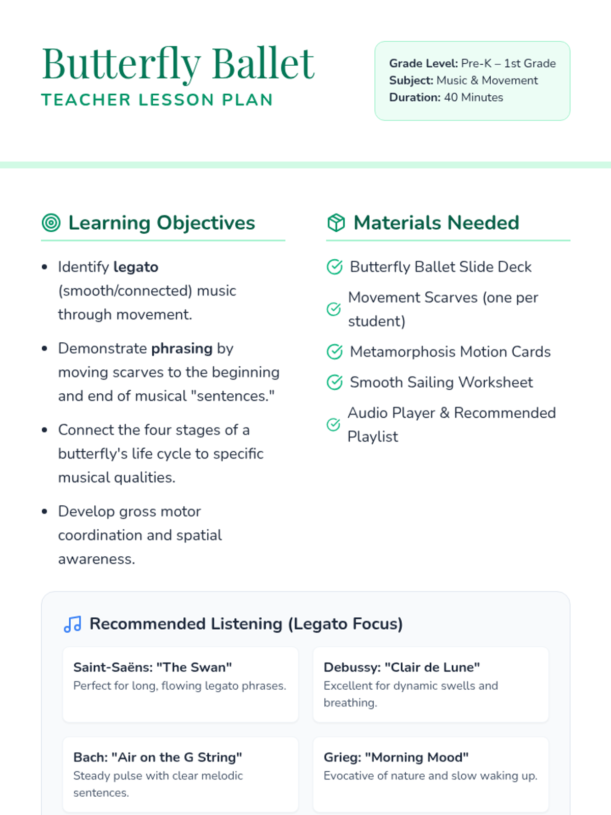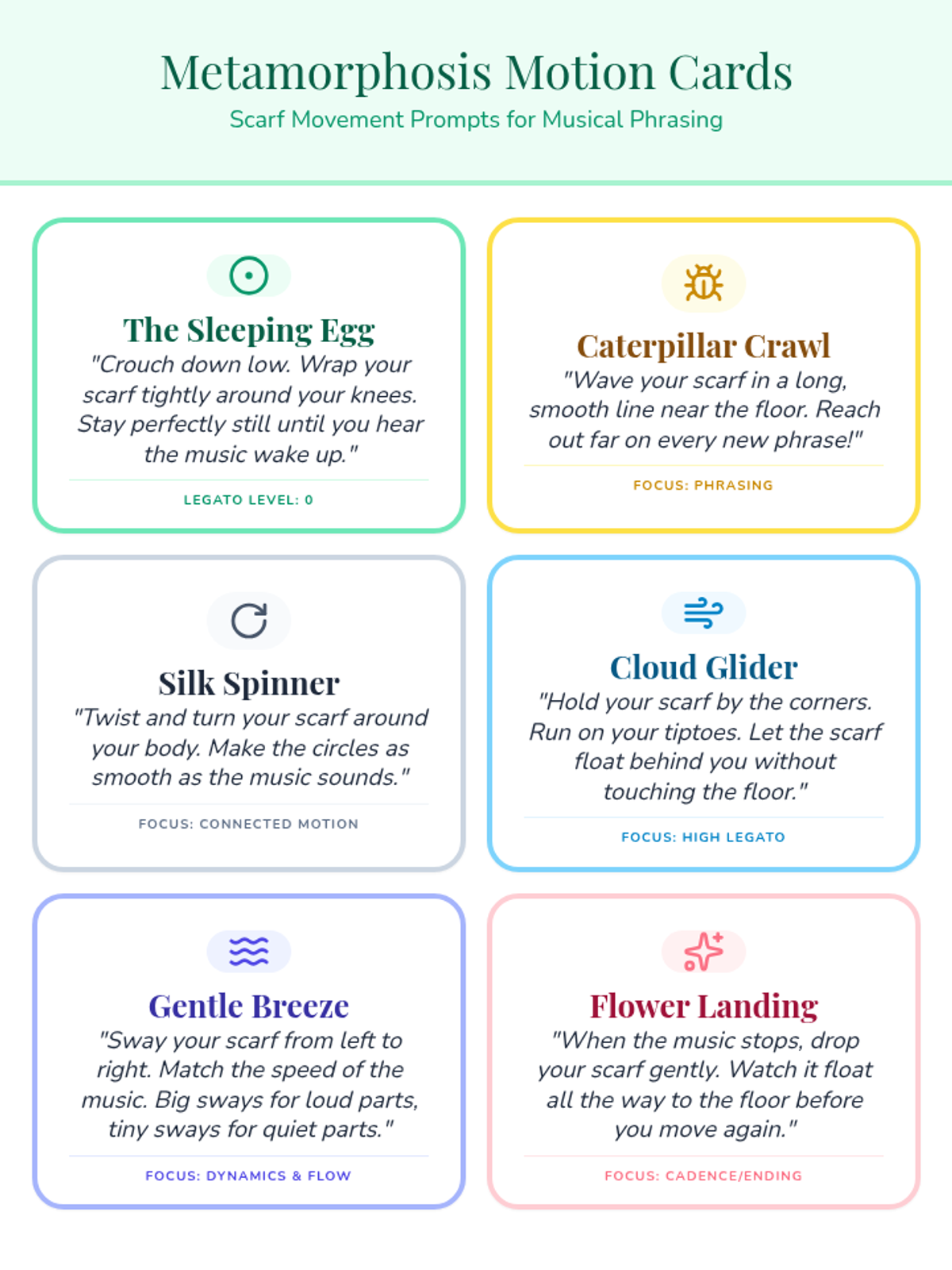 A music and movement lesson for early childhood students exploring phrasing and legato through the life cycle of a butterfly. Students use scarves to interpret smooth musical lines while learning about metamorphosis.