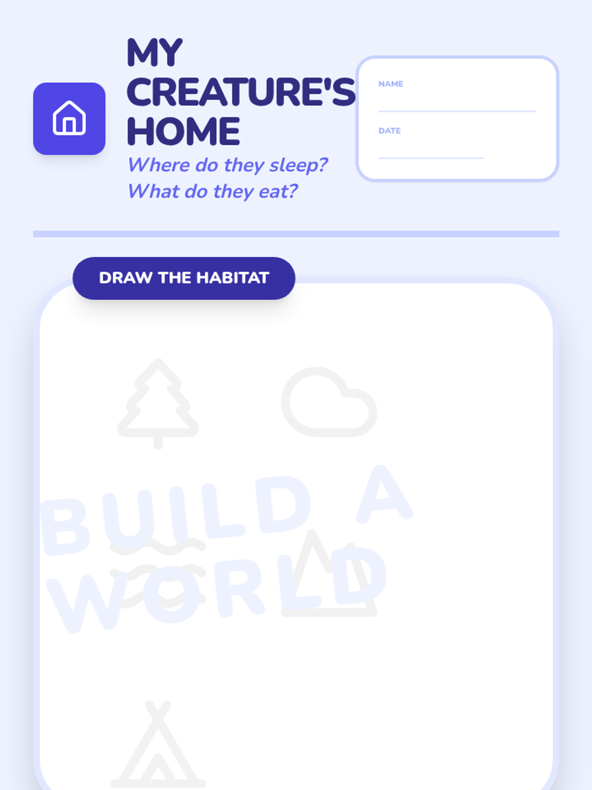 Students design a habitat for their creature, brainstorming what it needs to eat and where it sleeps.