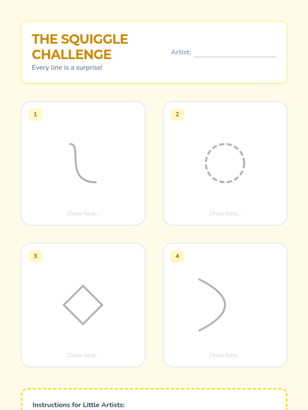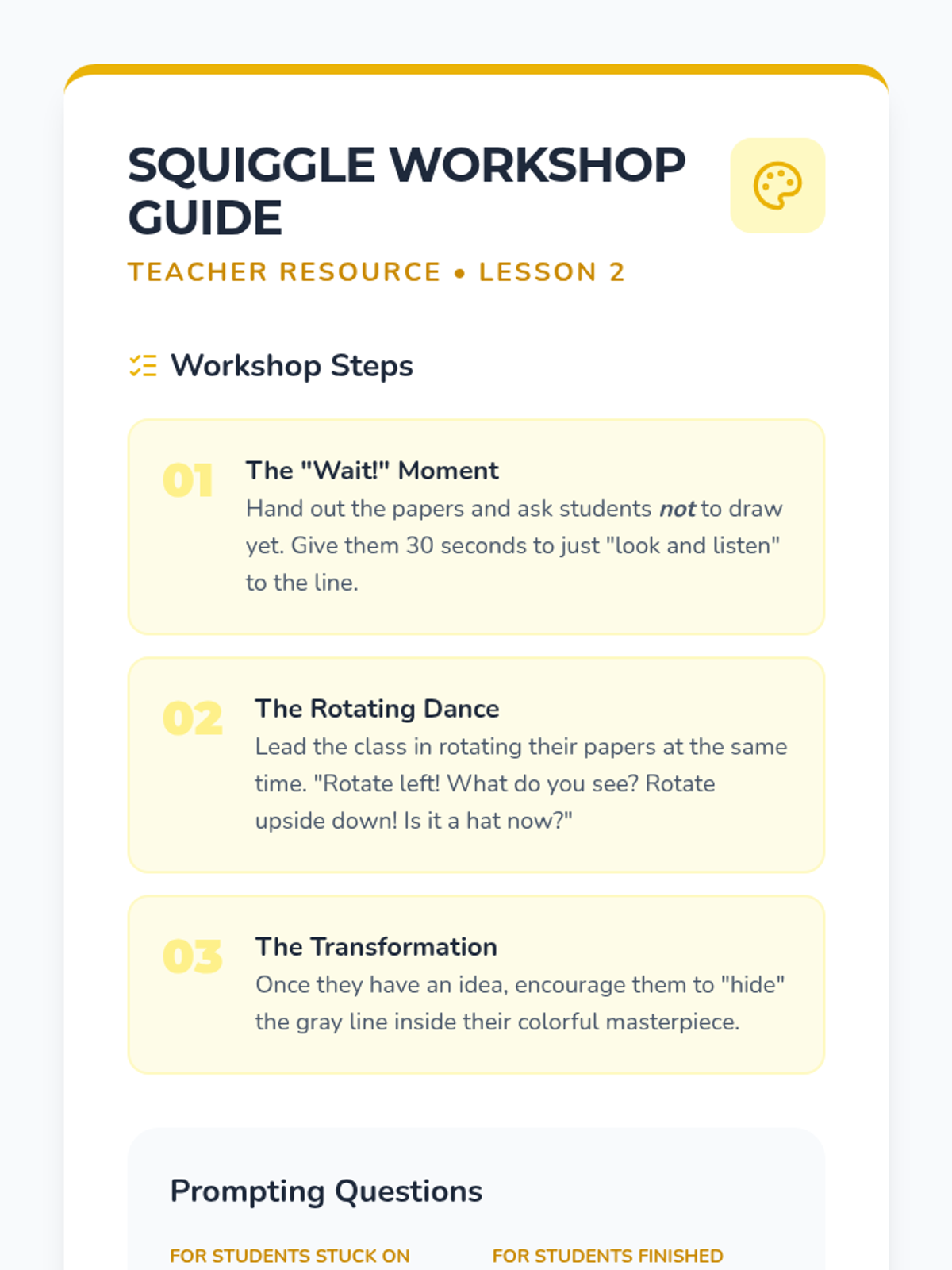 Students turn random marker squiggles into complete pictures, practicing flexible thinking and overcoming the 'blank page' challenge.