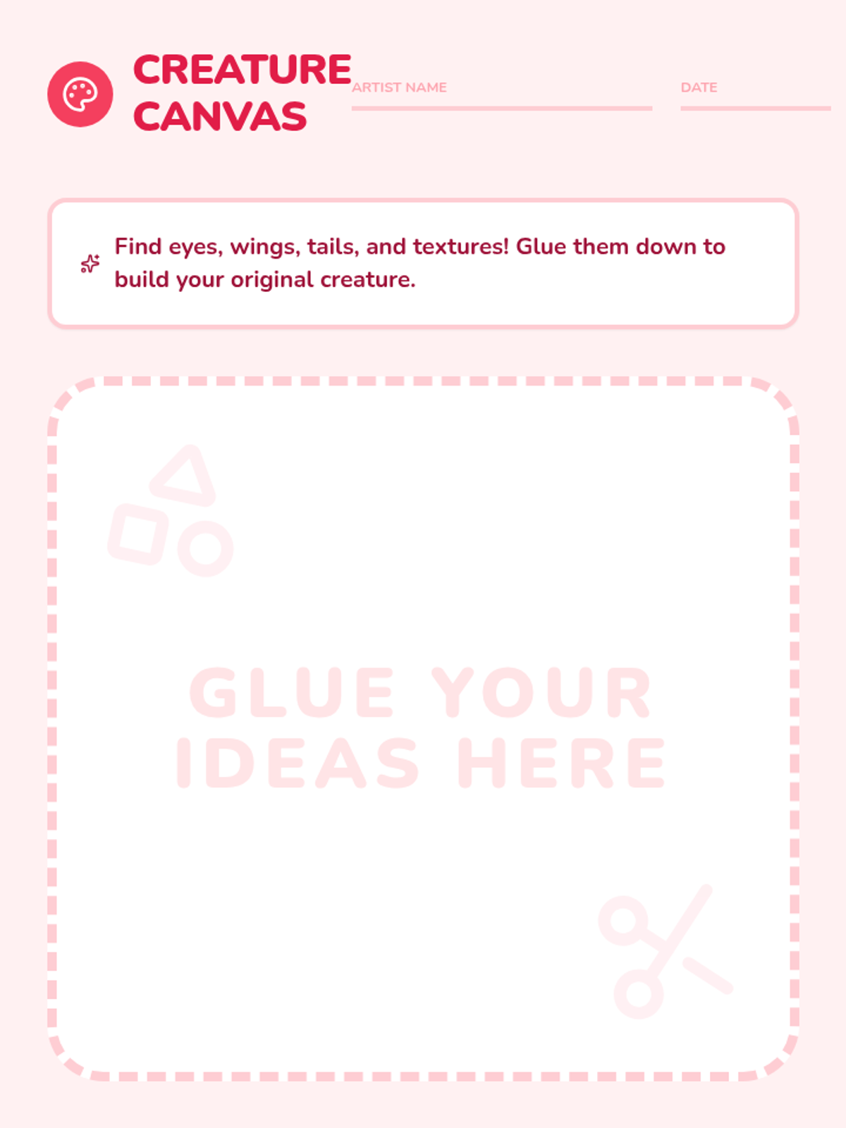 Students use pre-cut shapes and textures to glue together original creatures, focusing on material selection and composition.