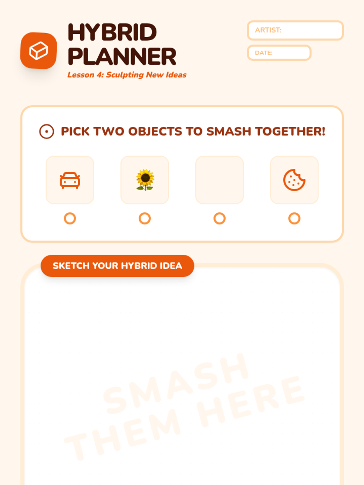 Students use clay to merge two different objects (like a car and a flower) into a single 3D sculpture.