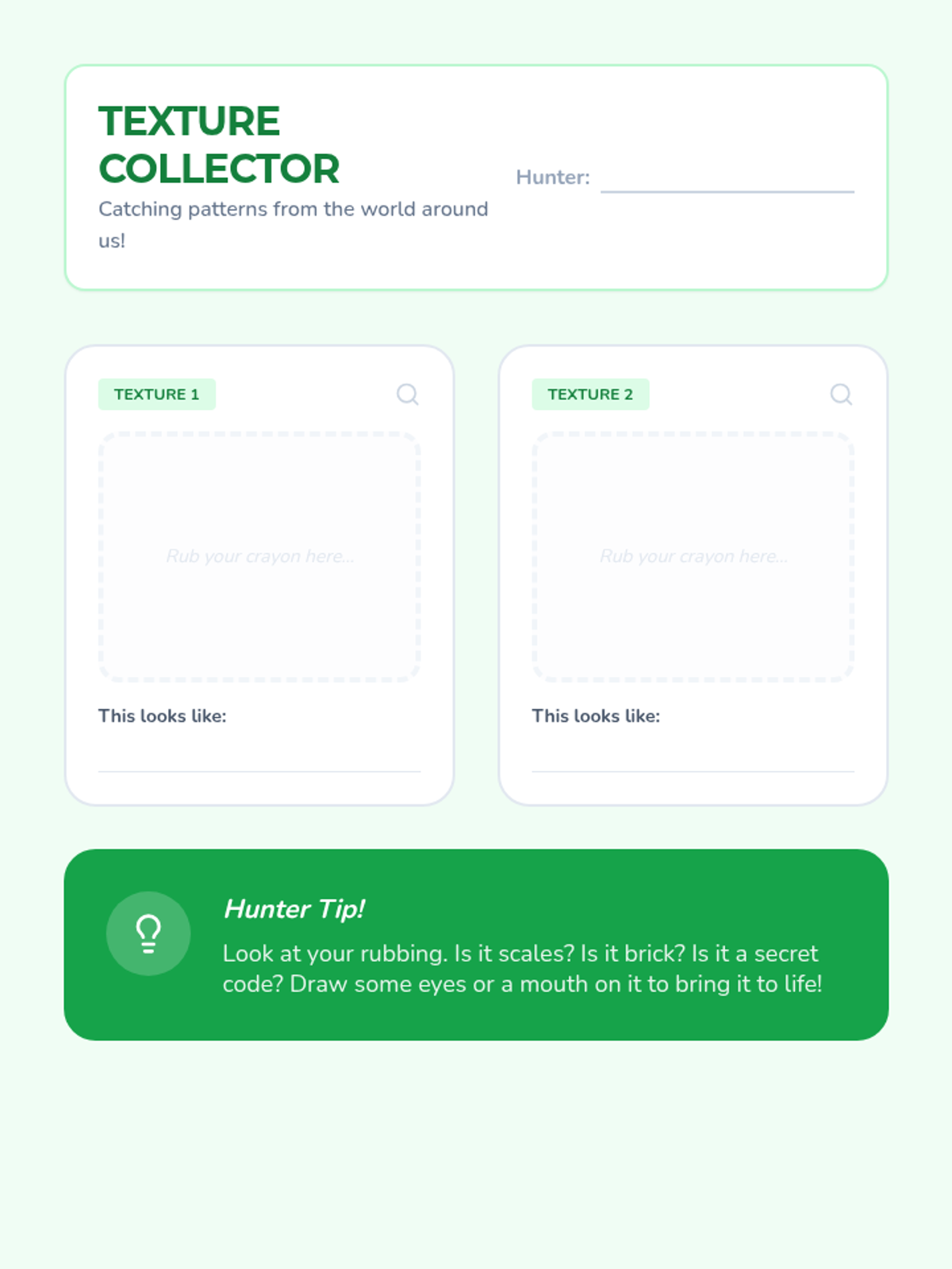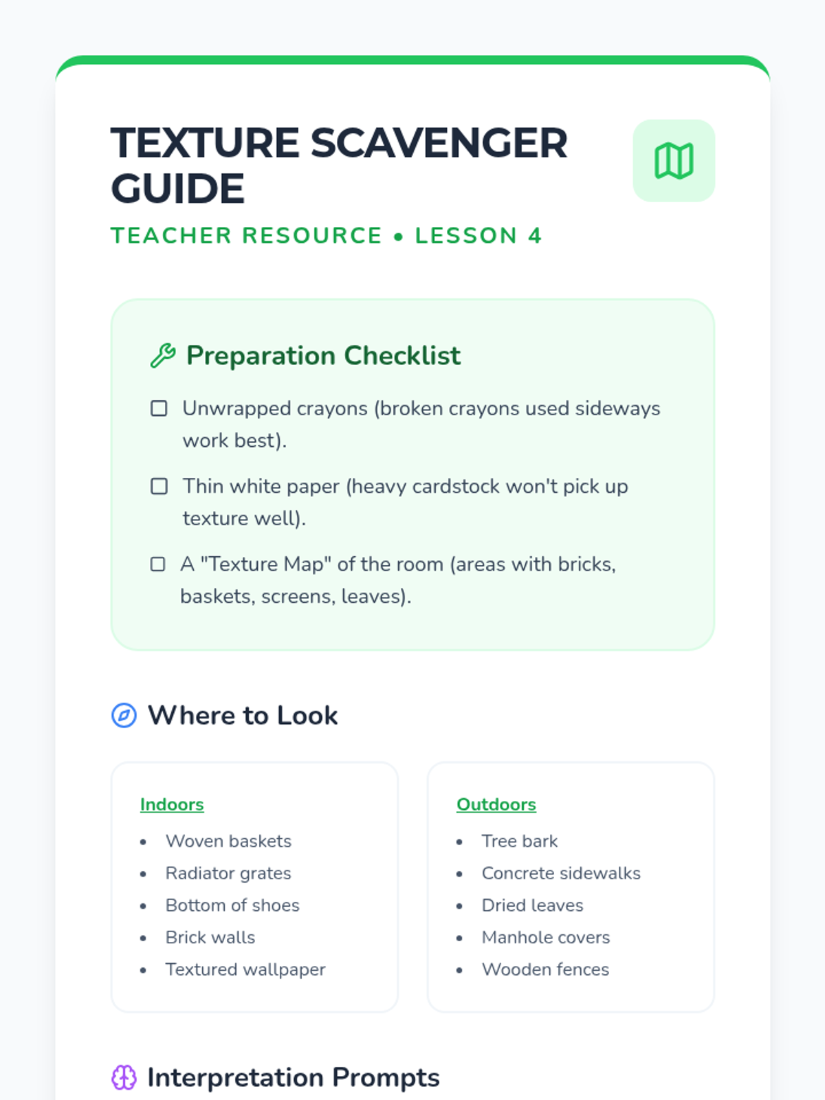 Students collect texture rubbings from their environment and interpret the patterns to generate creative ideas.