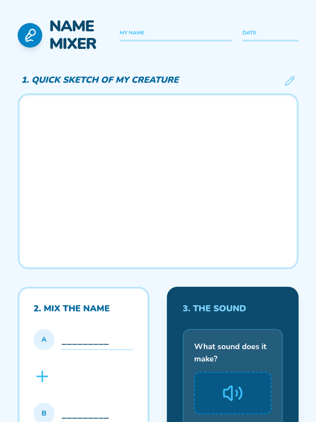 Students invent names and sounds for their creations by combining existing words and phonemes.