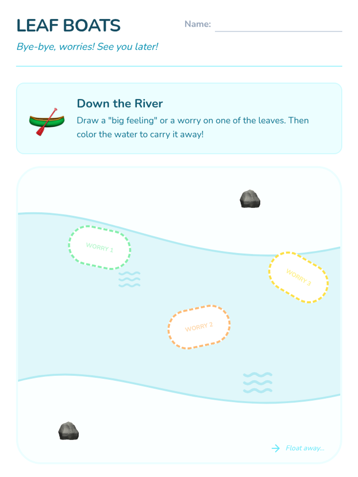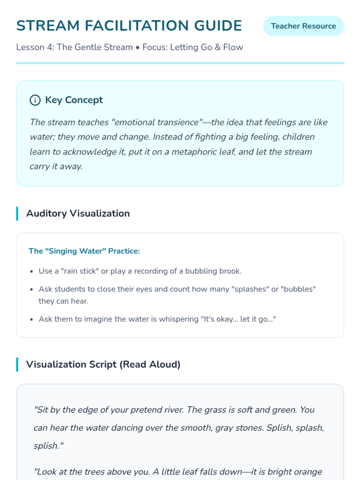 Using water imagery, students imagine watching worries float away like leaves on a peaceful stream to understand the flow of emotions.