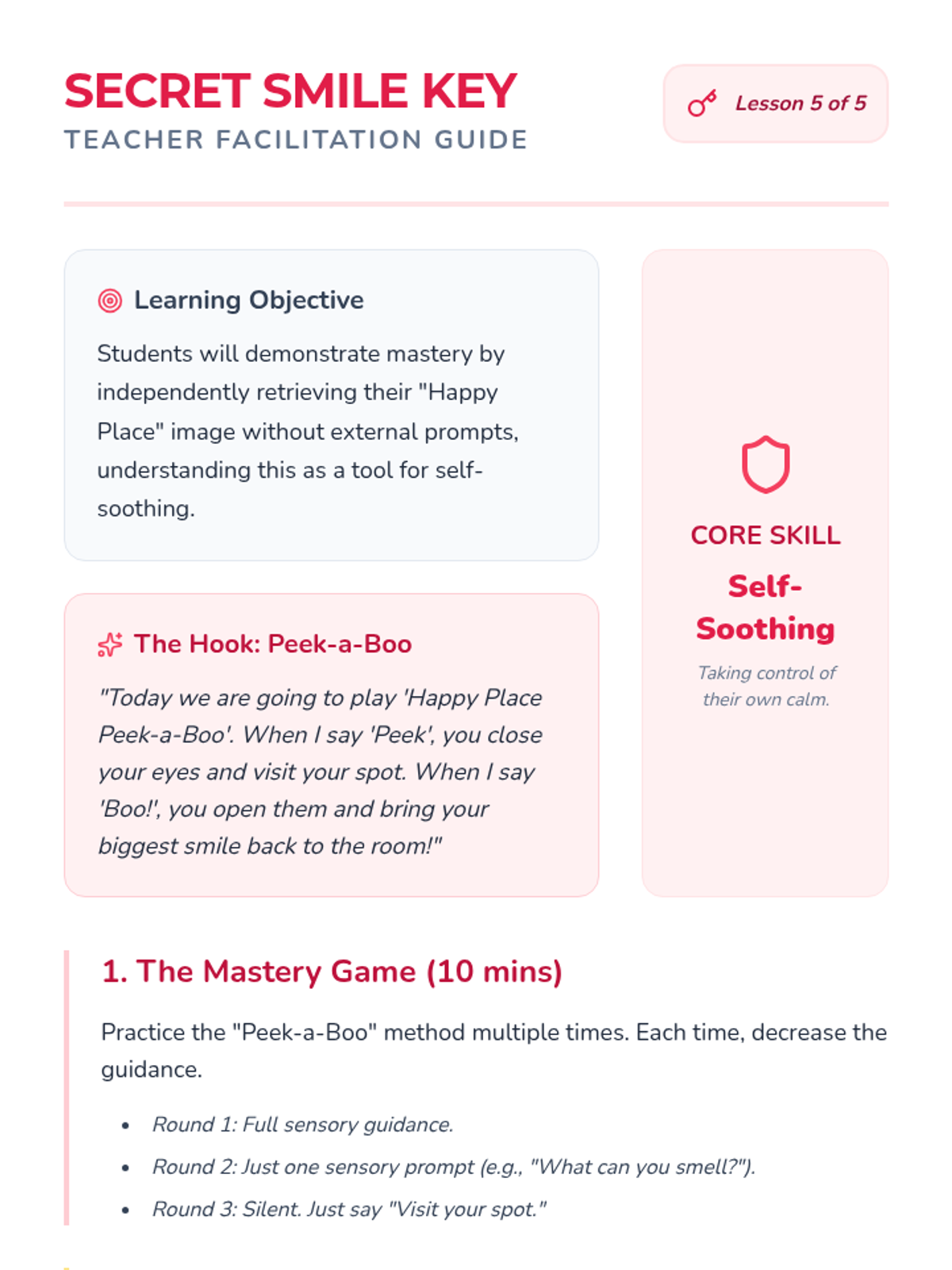 Students practice closing their eyes and retrieving their mental photograph on command for independent self-soothing.