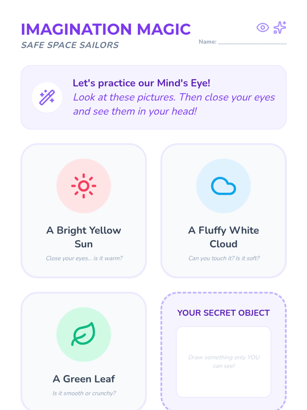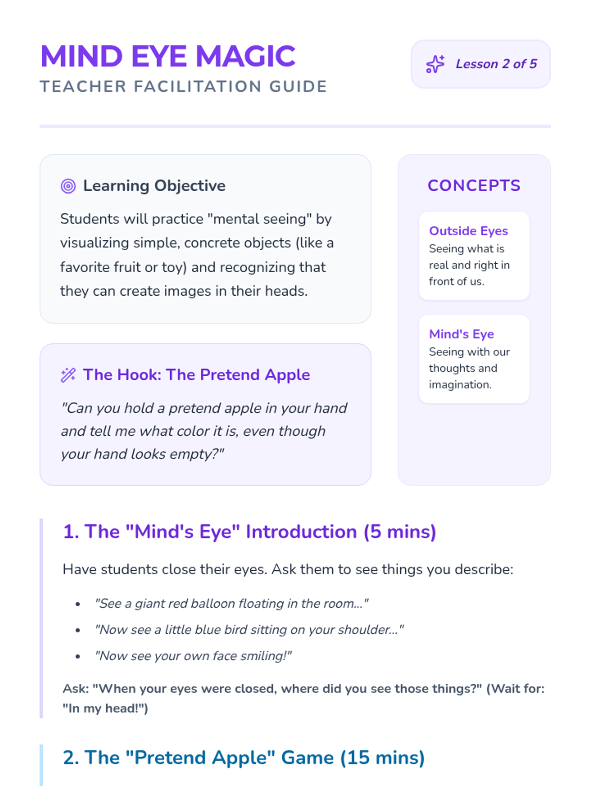 Children practice using their 'mind's eye' to see things that aren't physically present through guided prompts and imagination games.