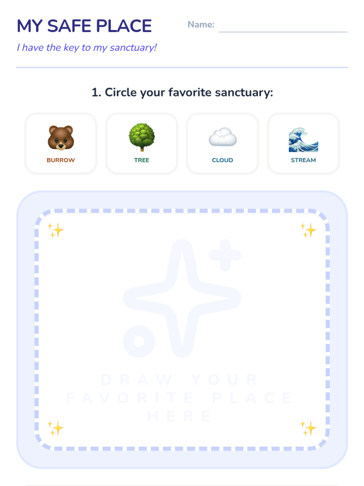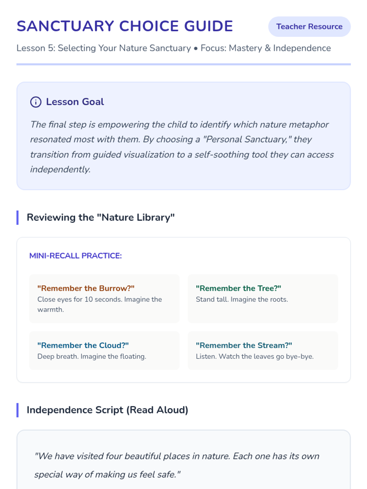 Students review the nature templates and choose their favorite visualization to practice recalling their safe place independently.