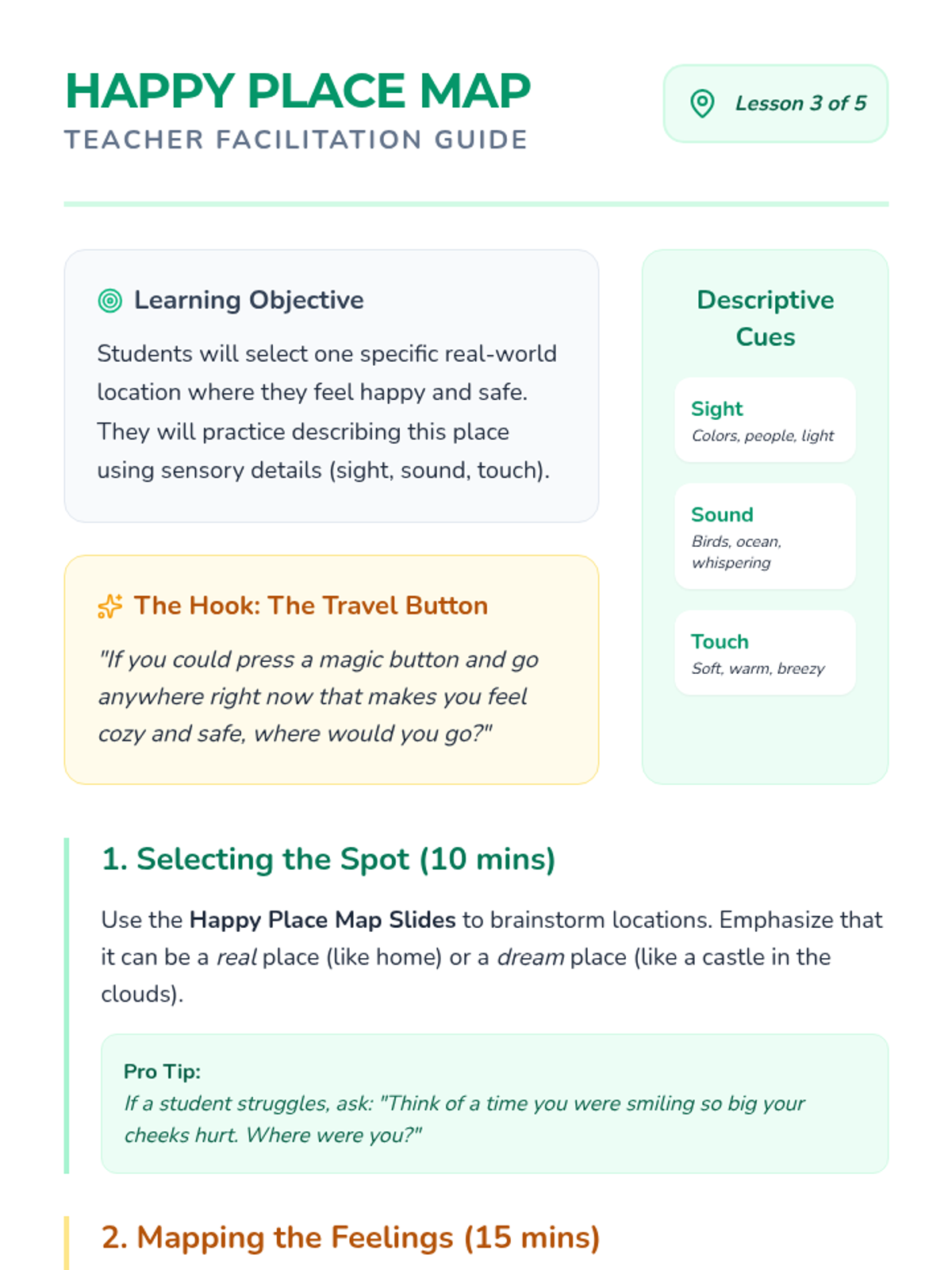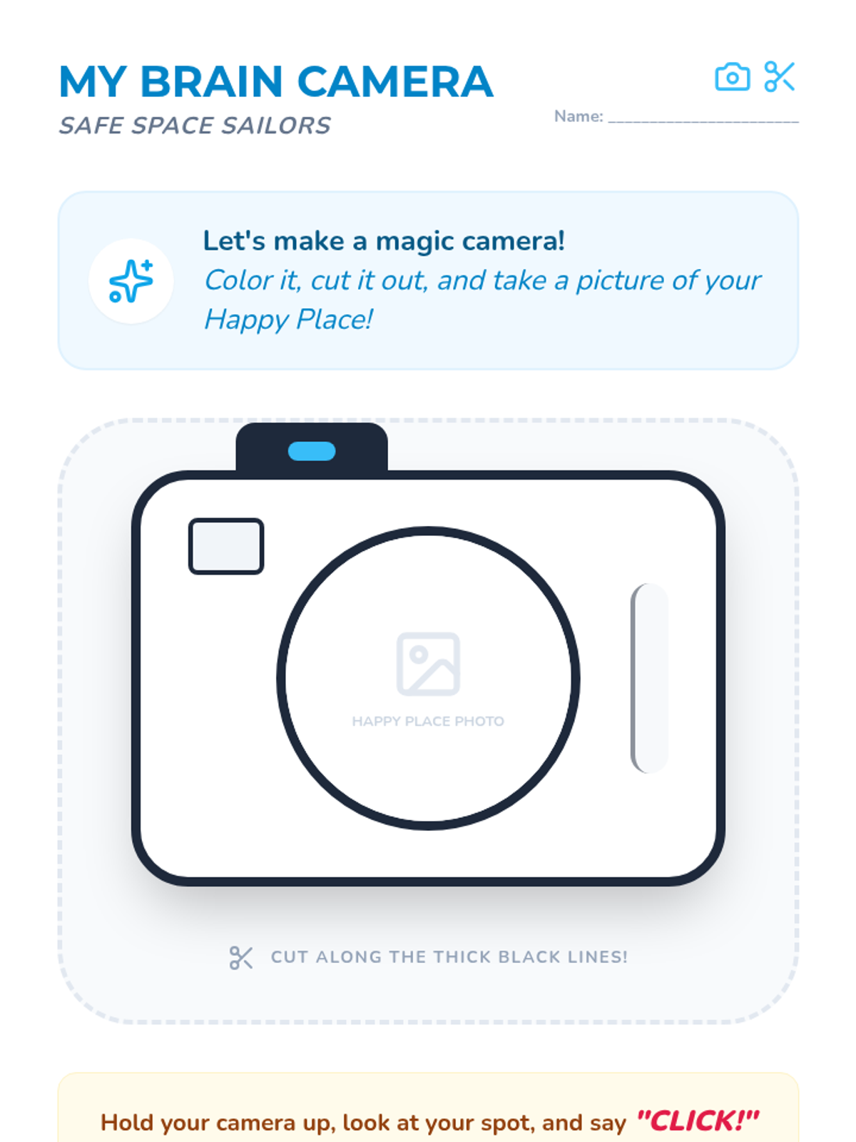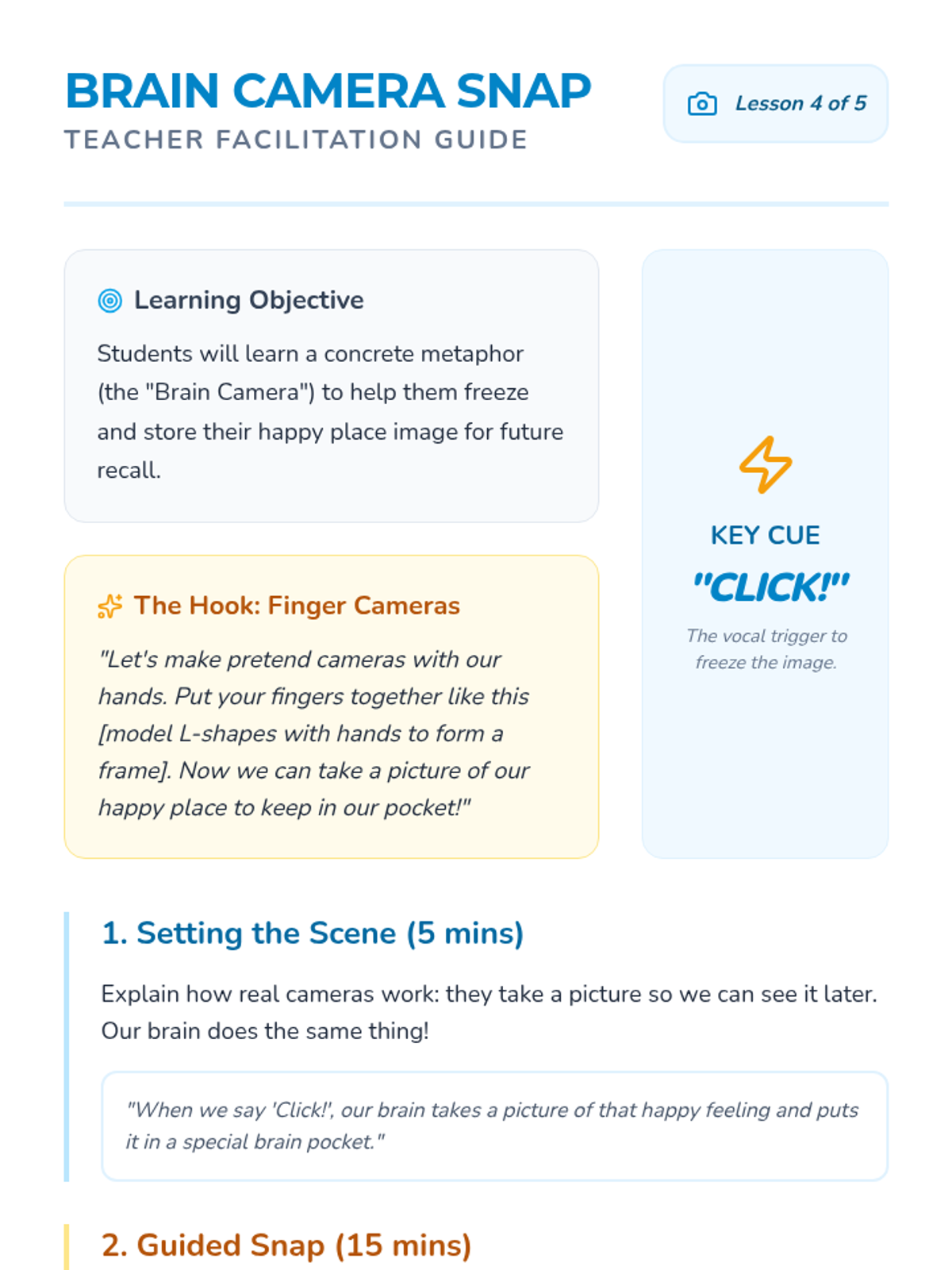 Using the metaphor of a camera, students learn to 'snap a picture' of their safe spot to keep in their brain.