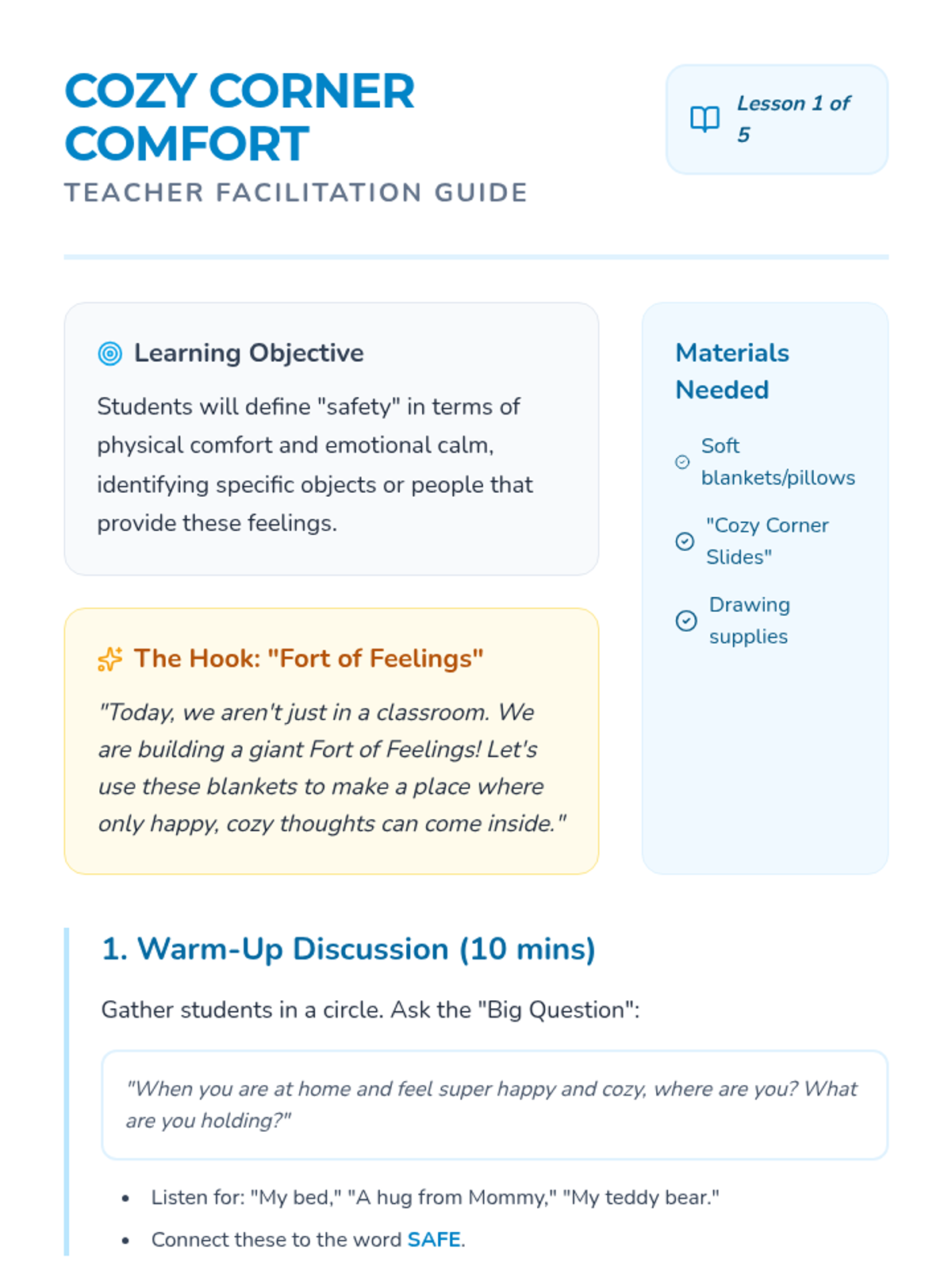 Students explore the concept of feeling 'safe' through discussion and identifying physical objects or places that make them feel protected.