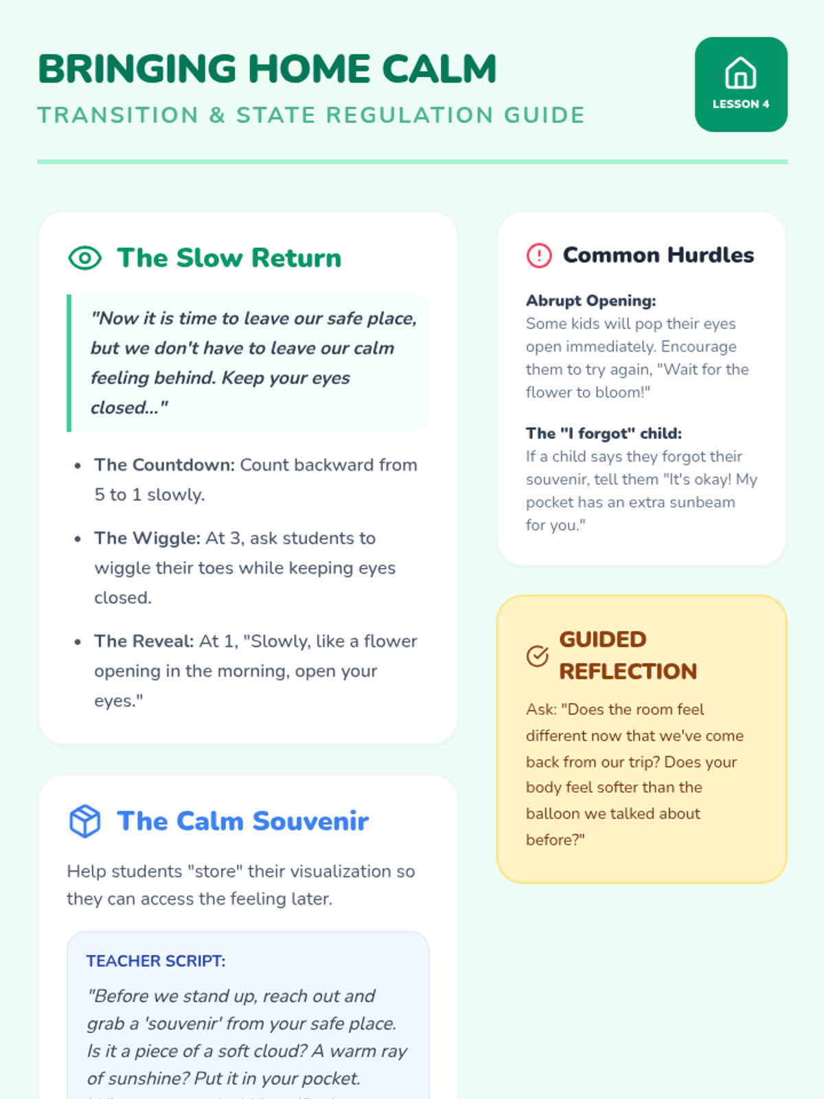Focusing on the transition back to the classroom environment after visualization, learning to bring the 'calm feeling' back with them.