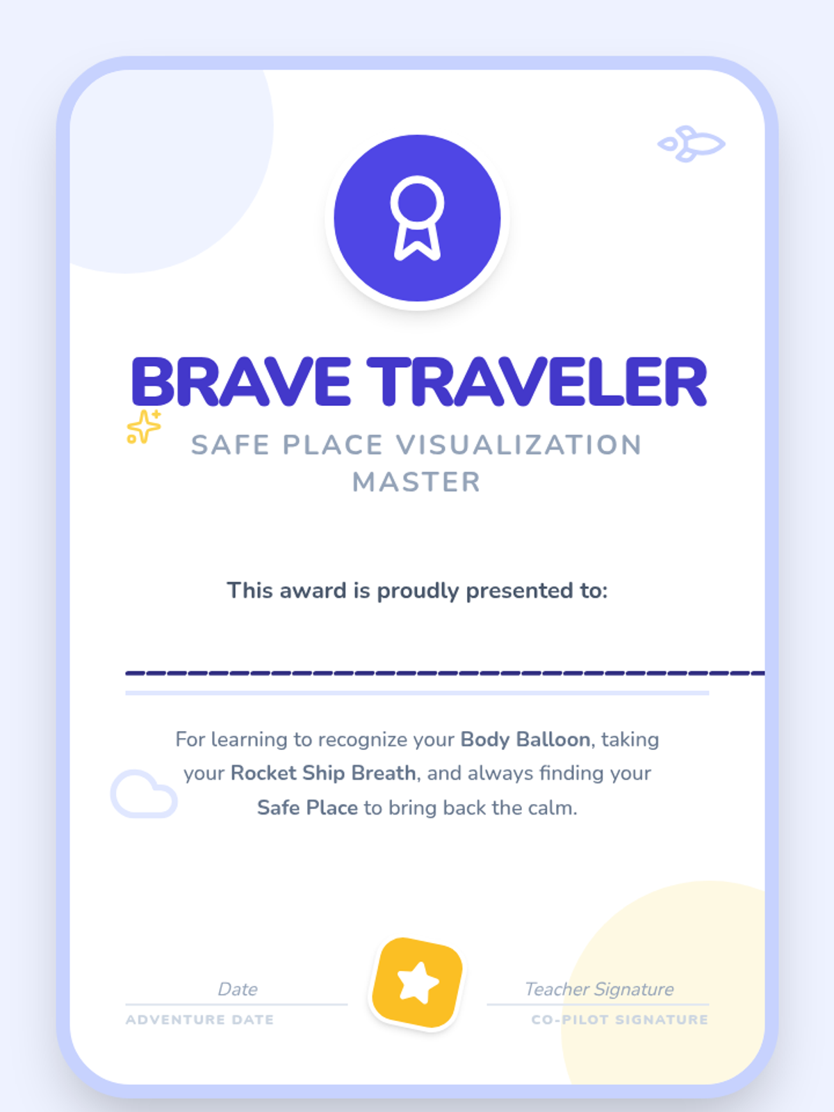 Introduction of the 'Rocket Ship Breath' as a physical anchor and transition tool to enter the safe place visualization.
