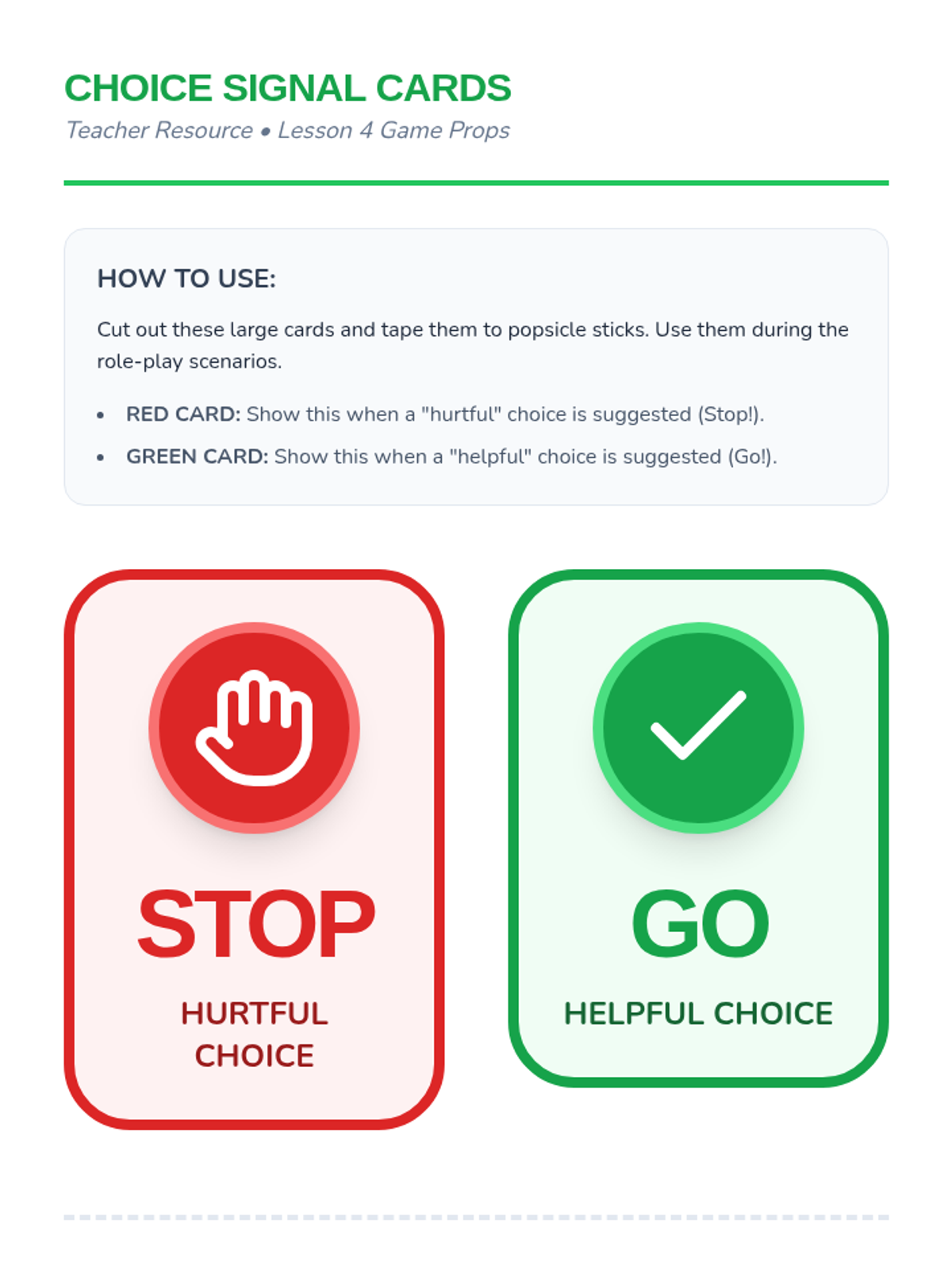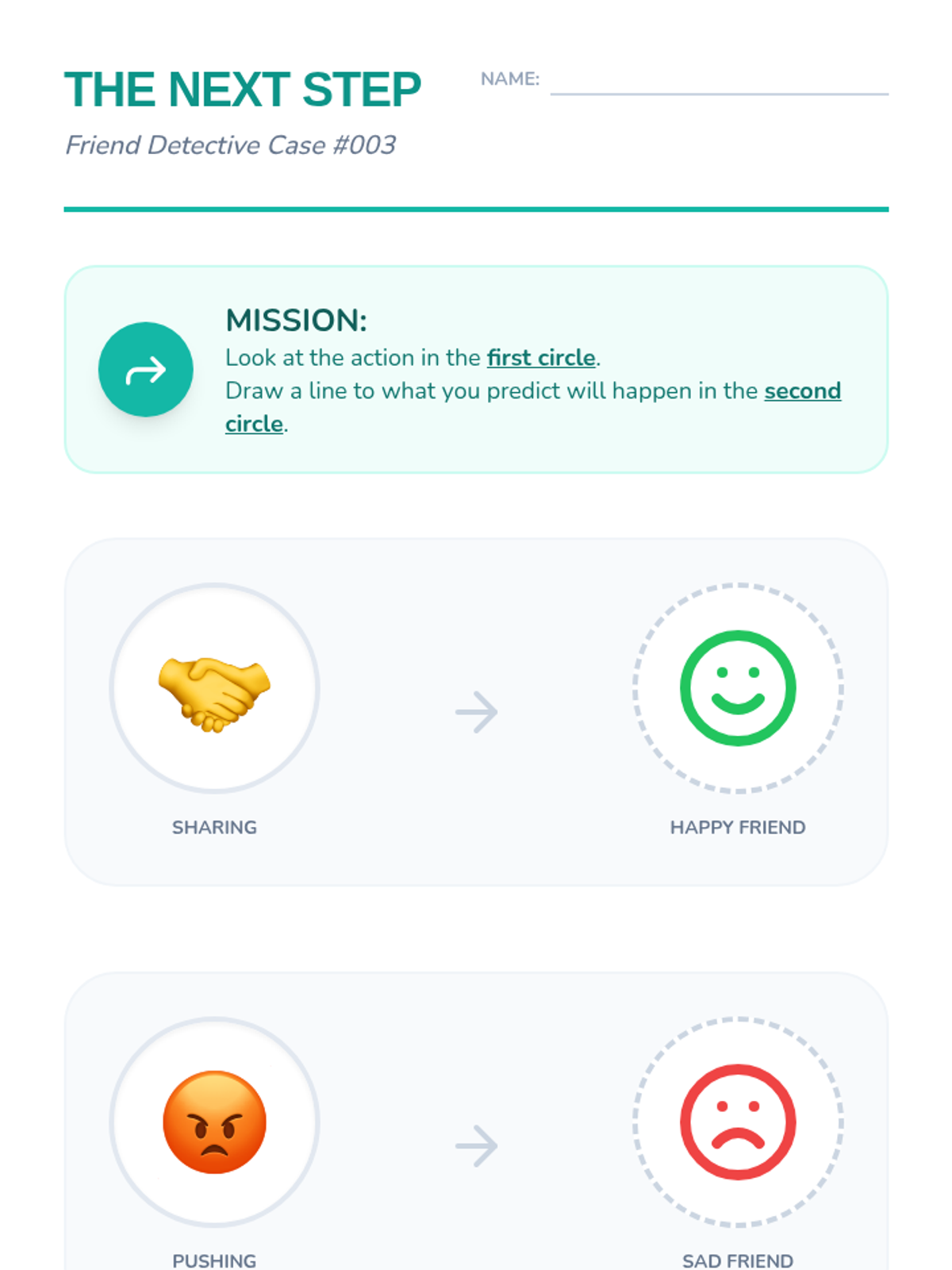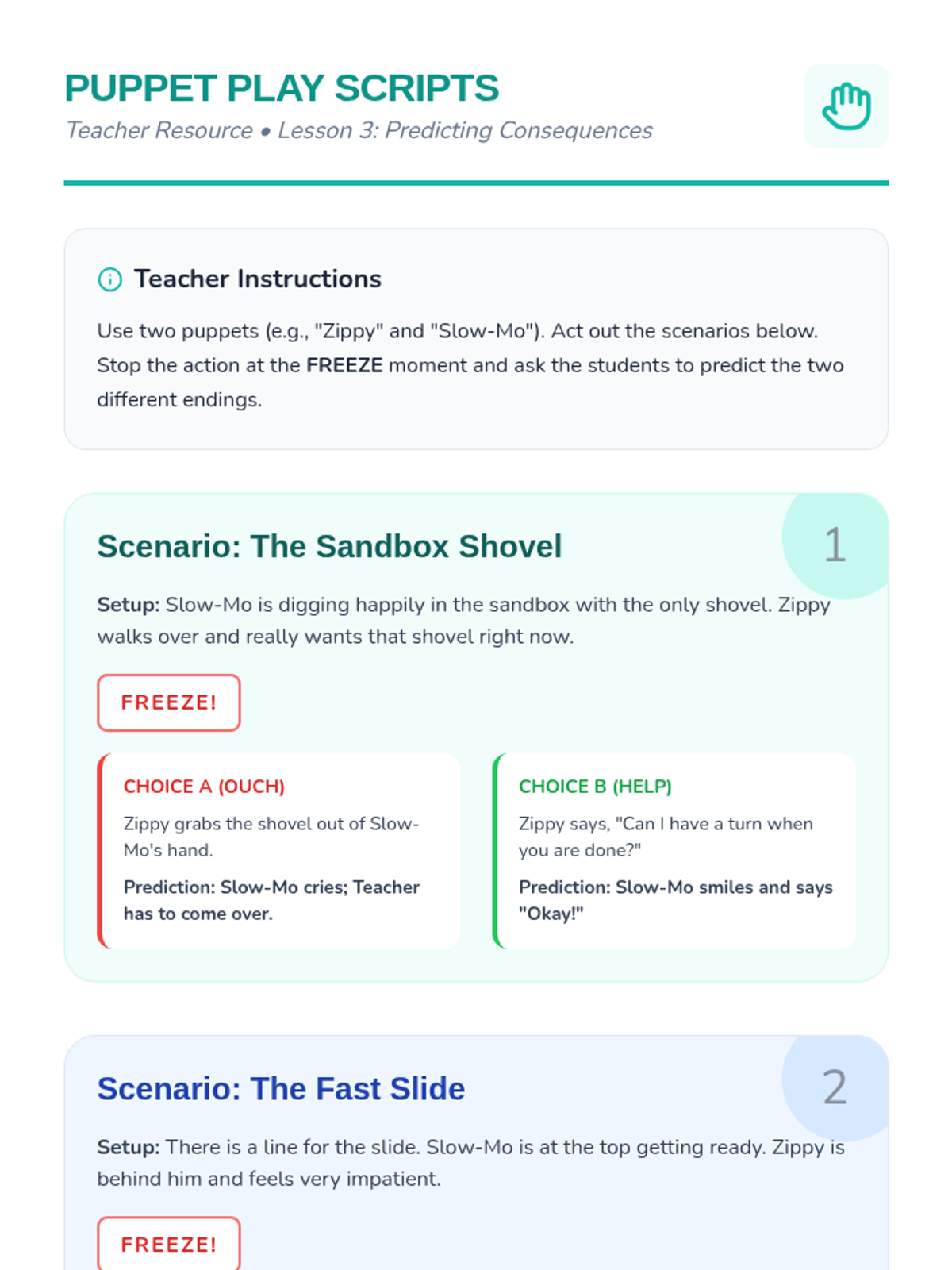 Using puppets, the teacher presents social scenarios where the action freezes right before a decision is made. Students discuss and predict what will happen next if the puppet chooses a negative action versus a positive one. This lesson builds the cognitive bridge between an action and its social result.