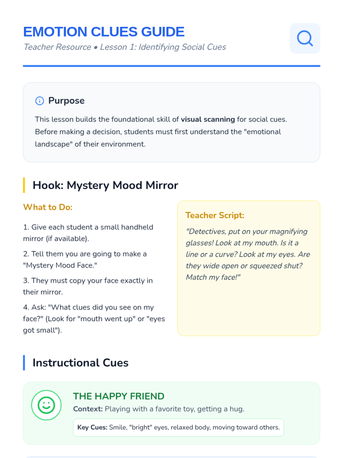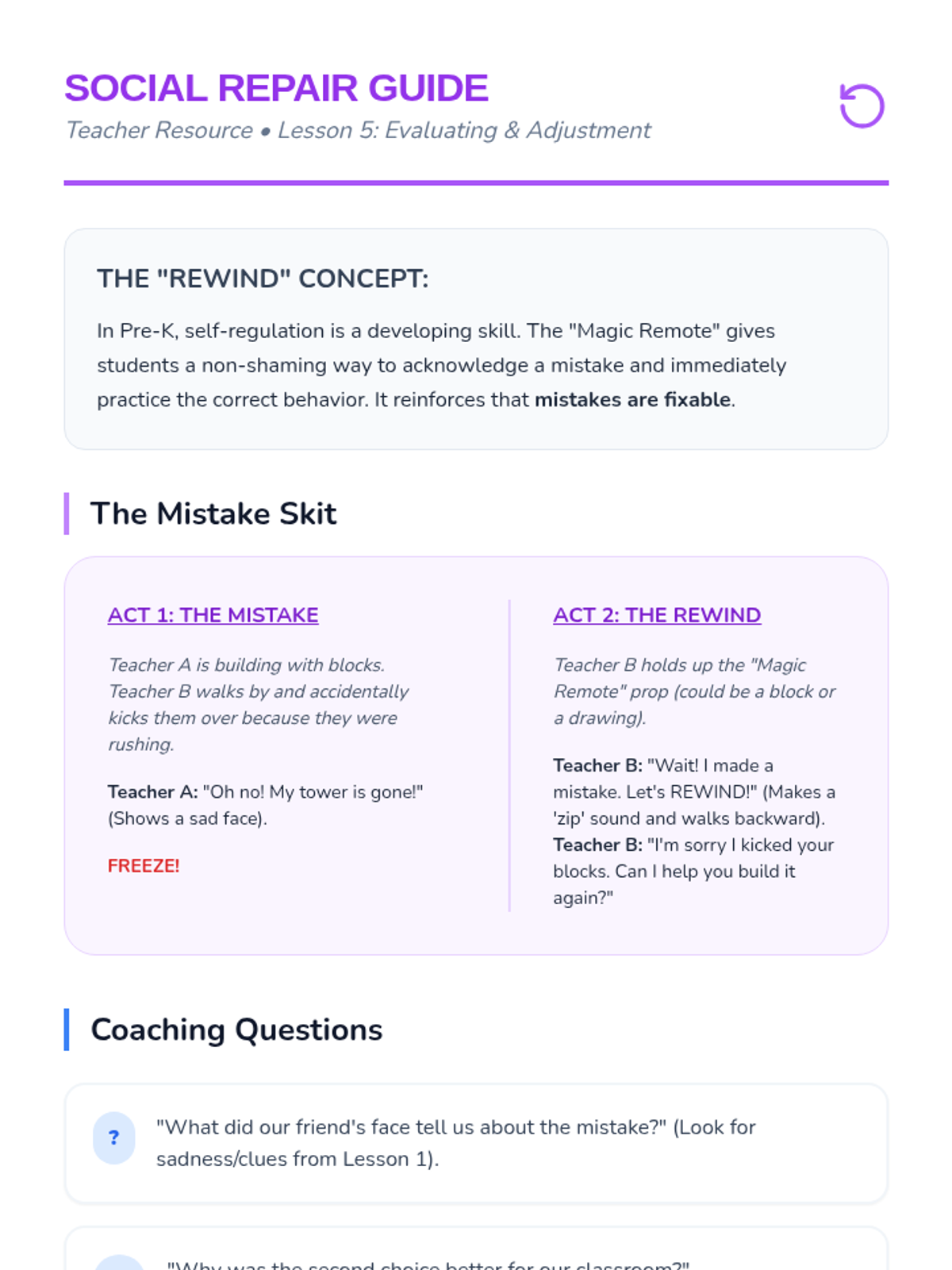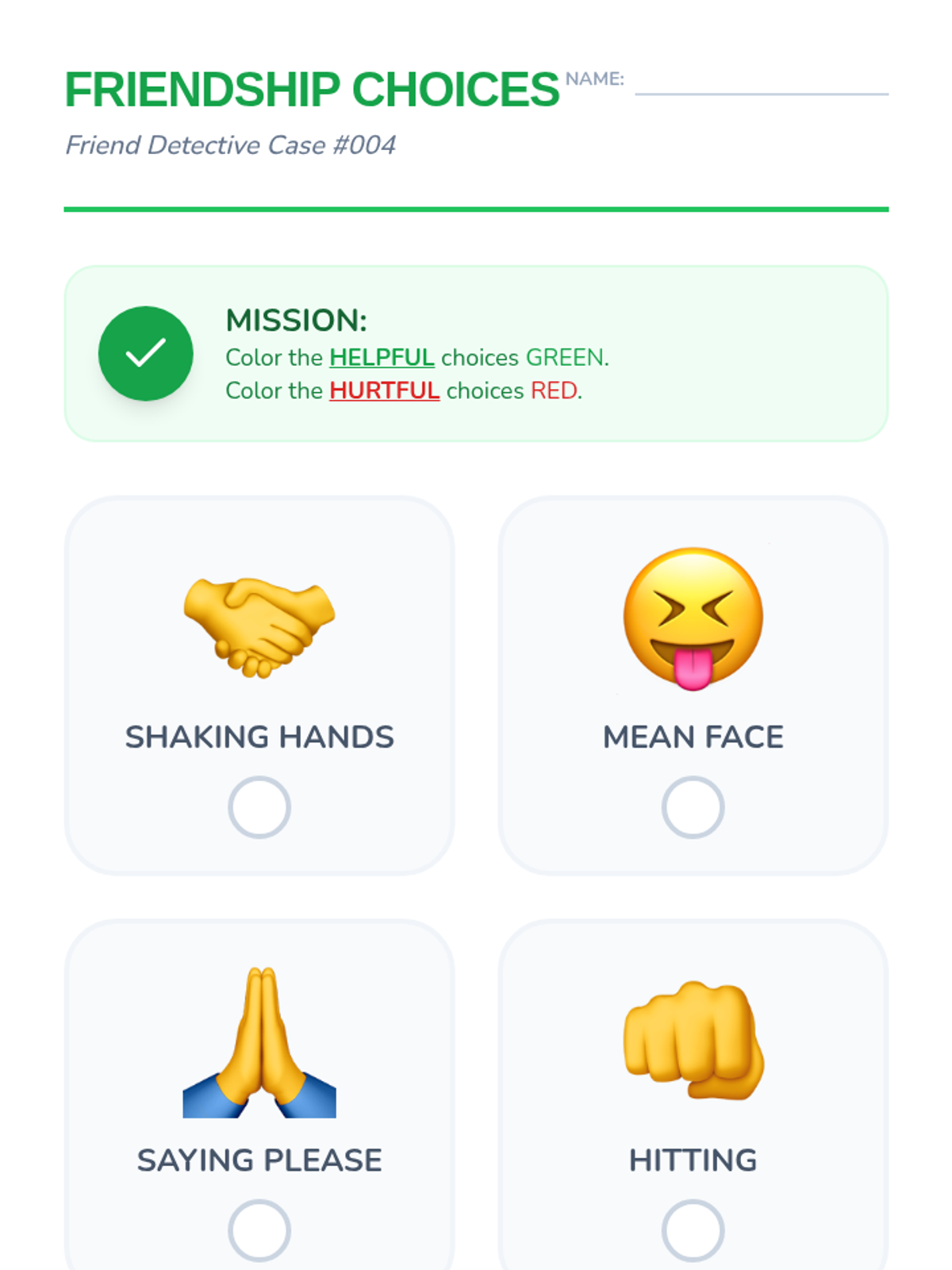 Using puppets, the teacher presents social scenarios where the action freezes right before a decision is made. Students discuss and predict what will happen next if the puppet chooses a negative action versus a positive one. This lesson builds the cognitive bridge between an action and its social result.