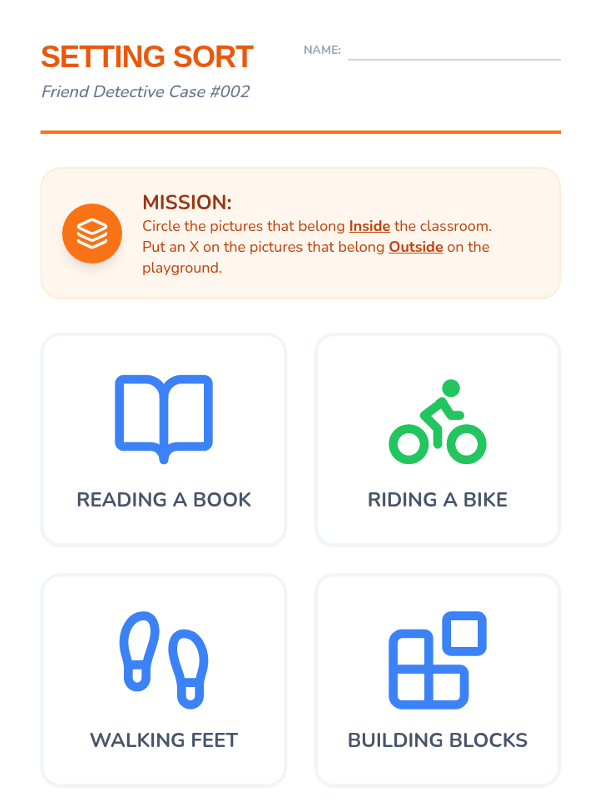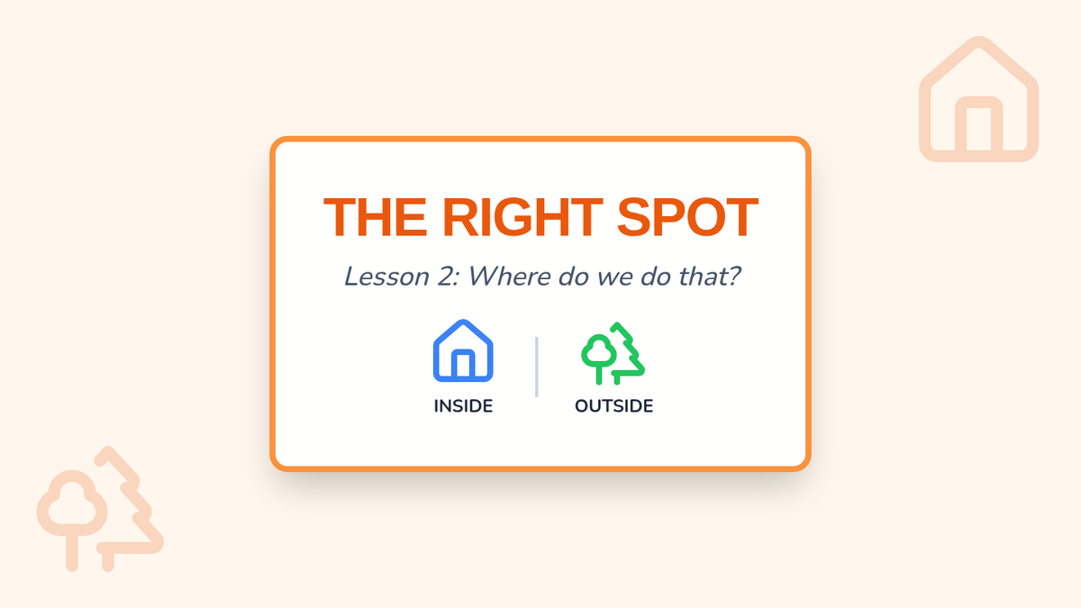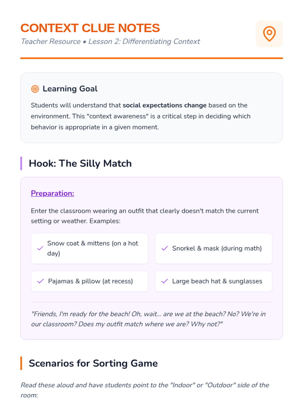 Learners engage in a sorting game to distinguish between 'indoor' and 'outdoor' behaviors, establishing that the environment changes which choices are appropriate. Students classify actions like running or whispering into the correct setting categories using visual supports.