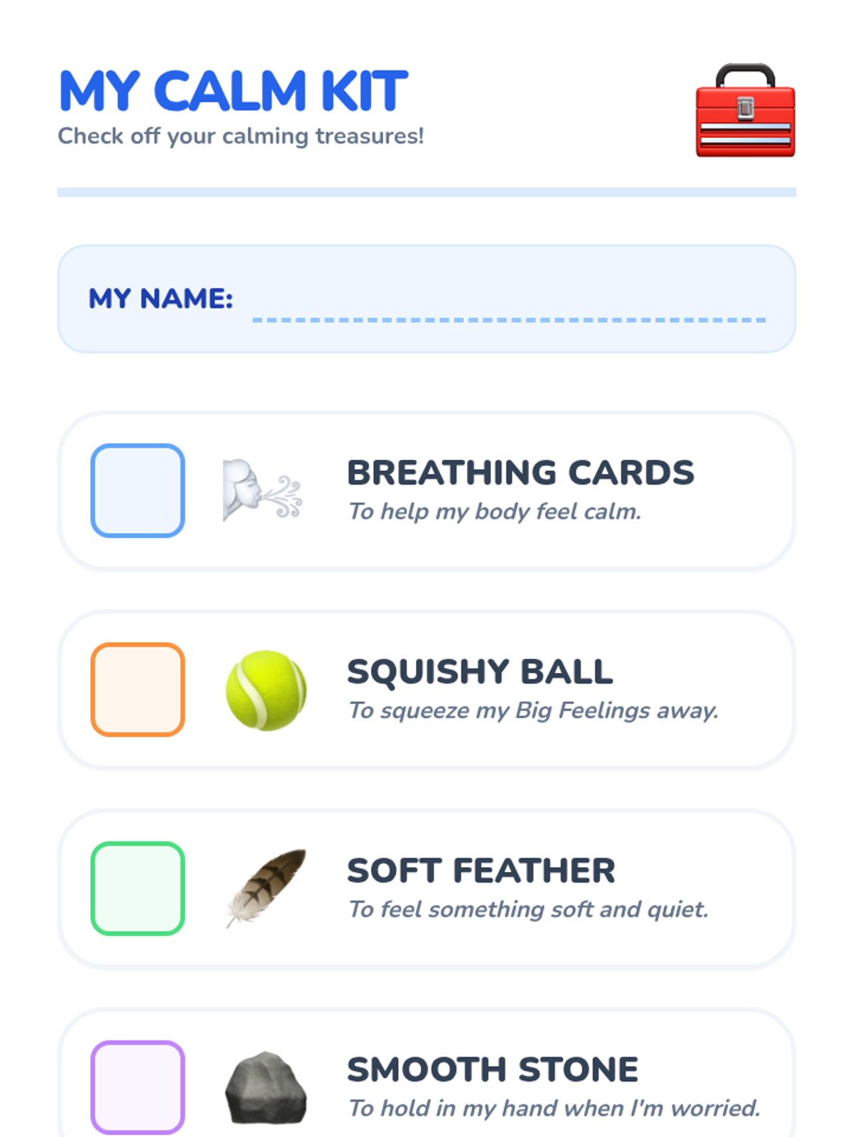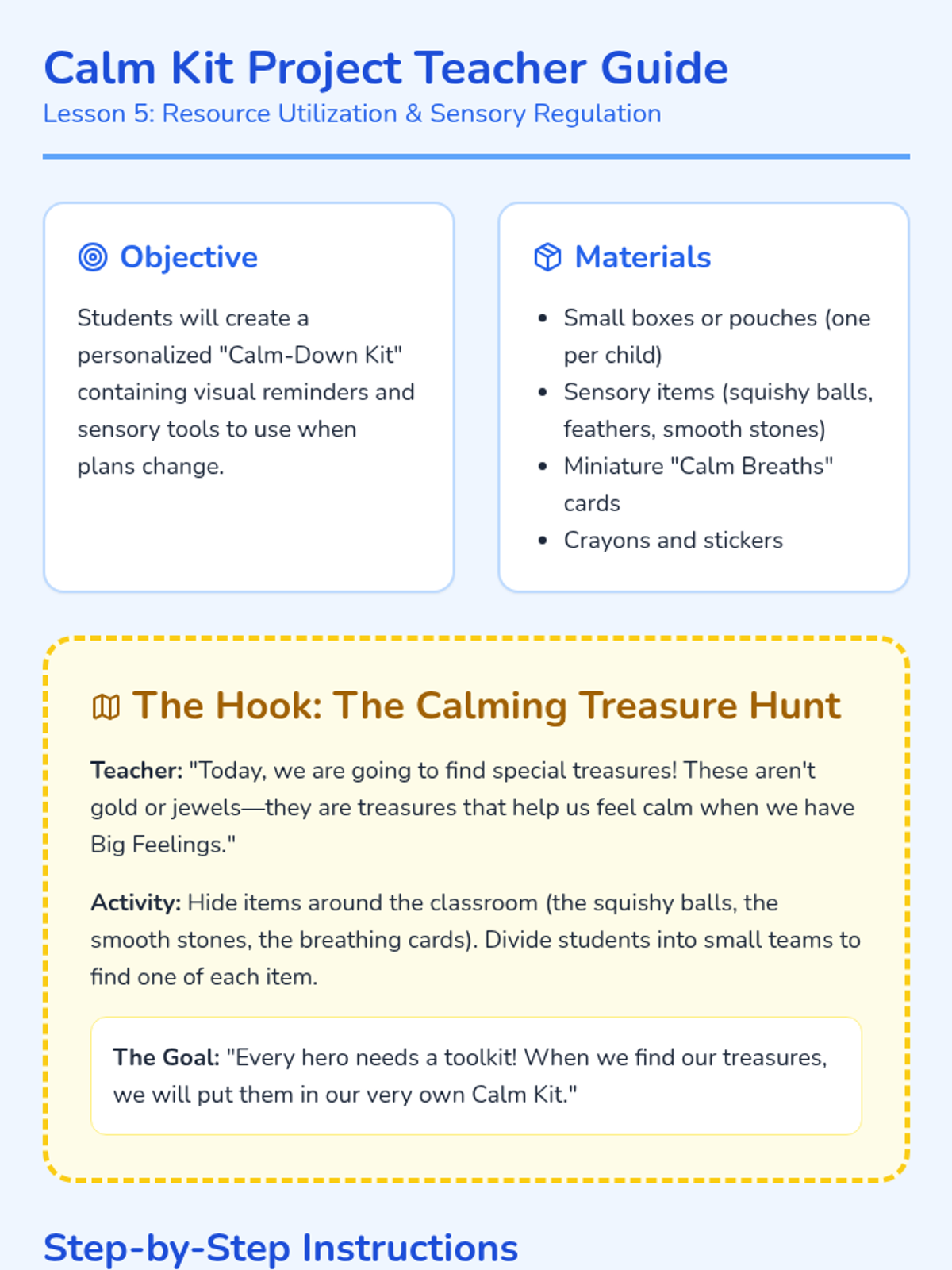 Students assemble a personalized calm-down kit with sensory items and visual reminders to use during stressful transitions.