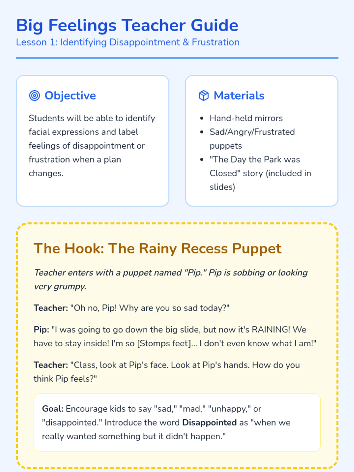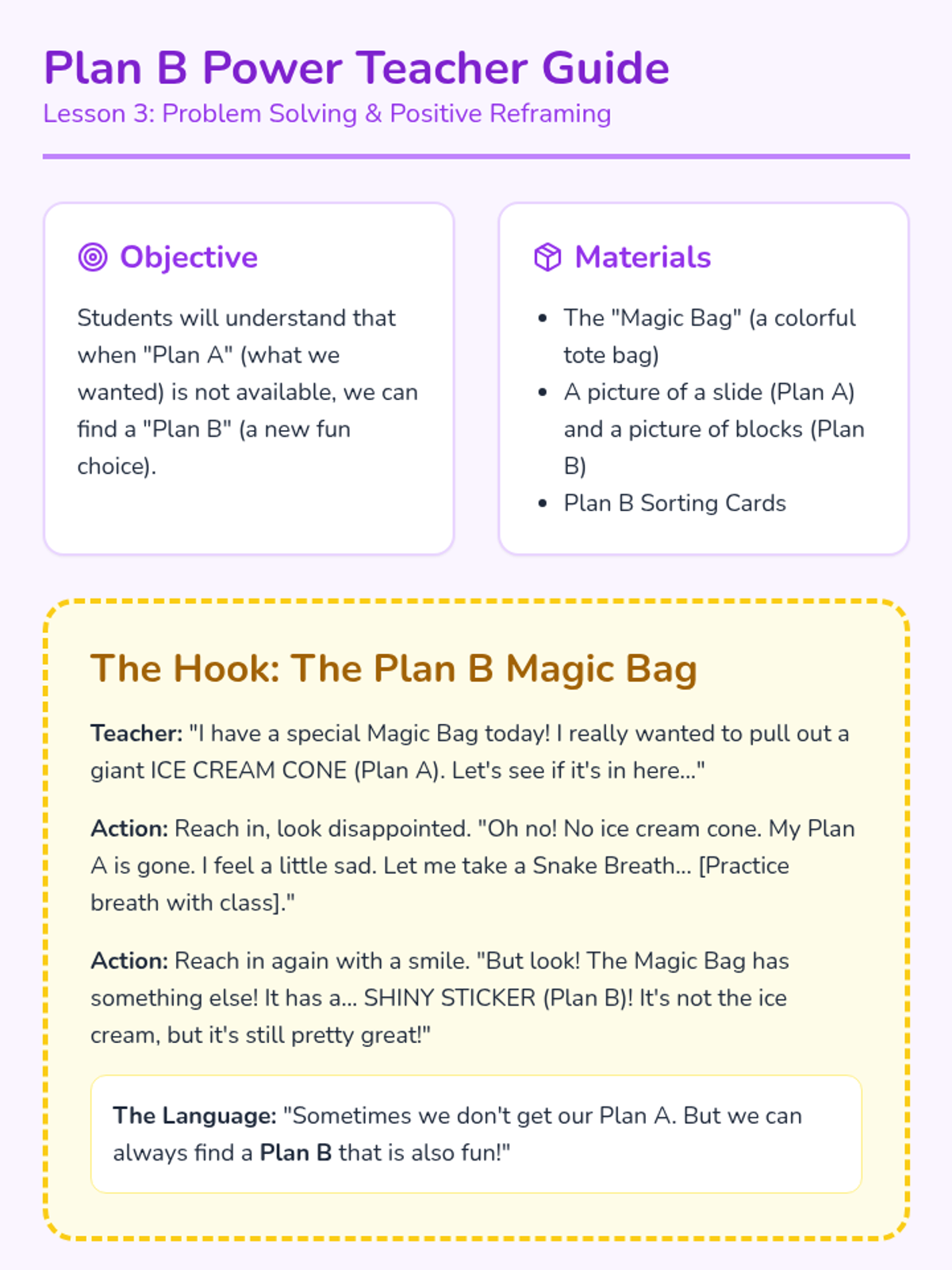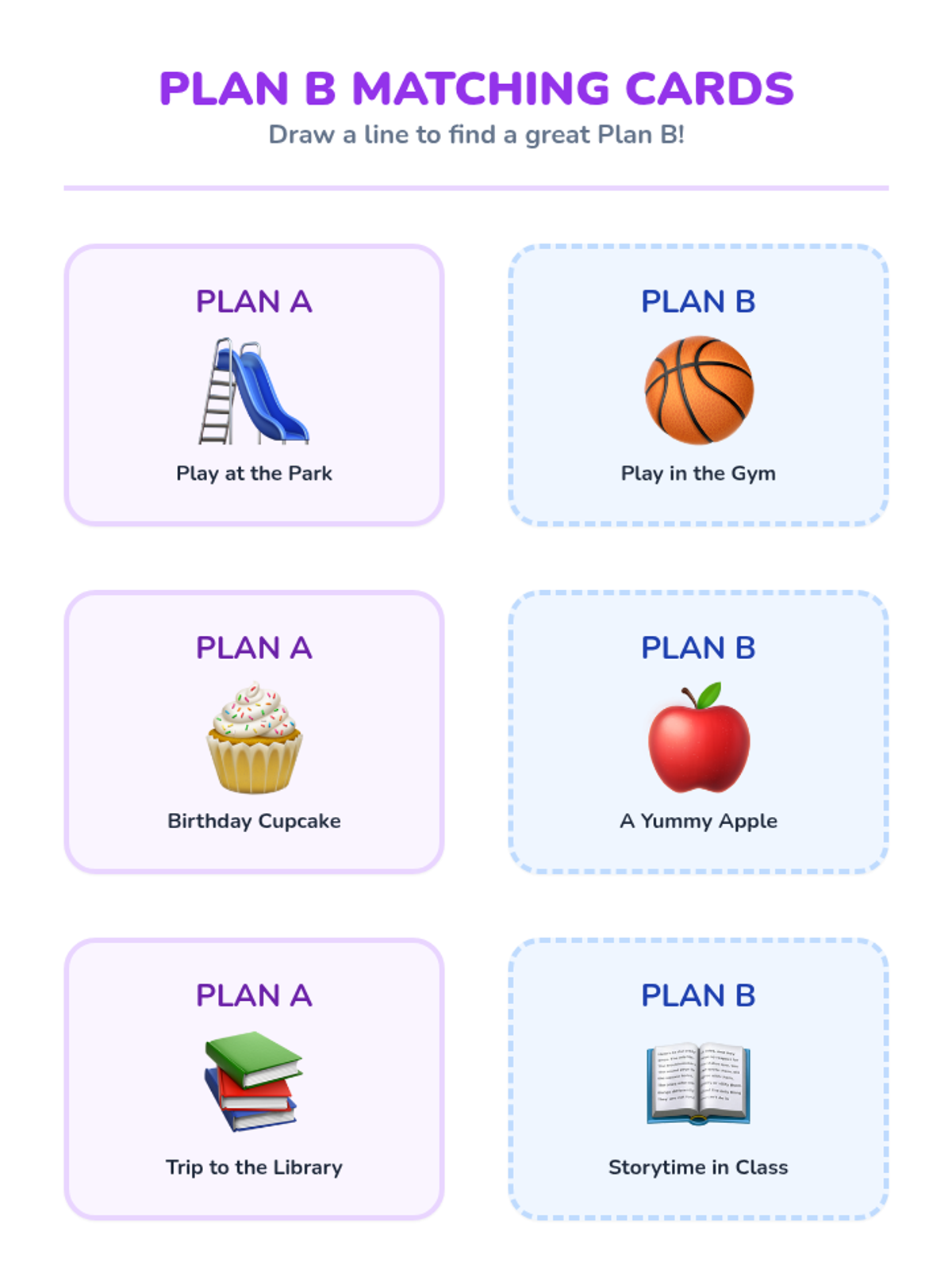 Students learn to distinguish between 'Plan A' and 'Plan B' and practice finding positive alternatives when things don't go as expected.