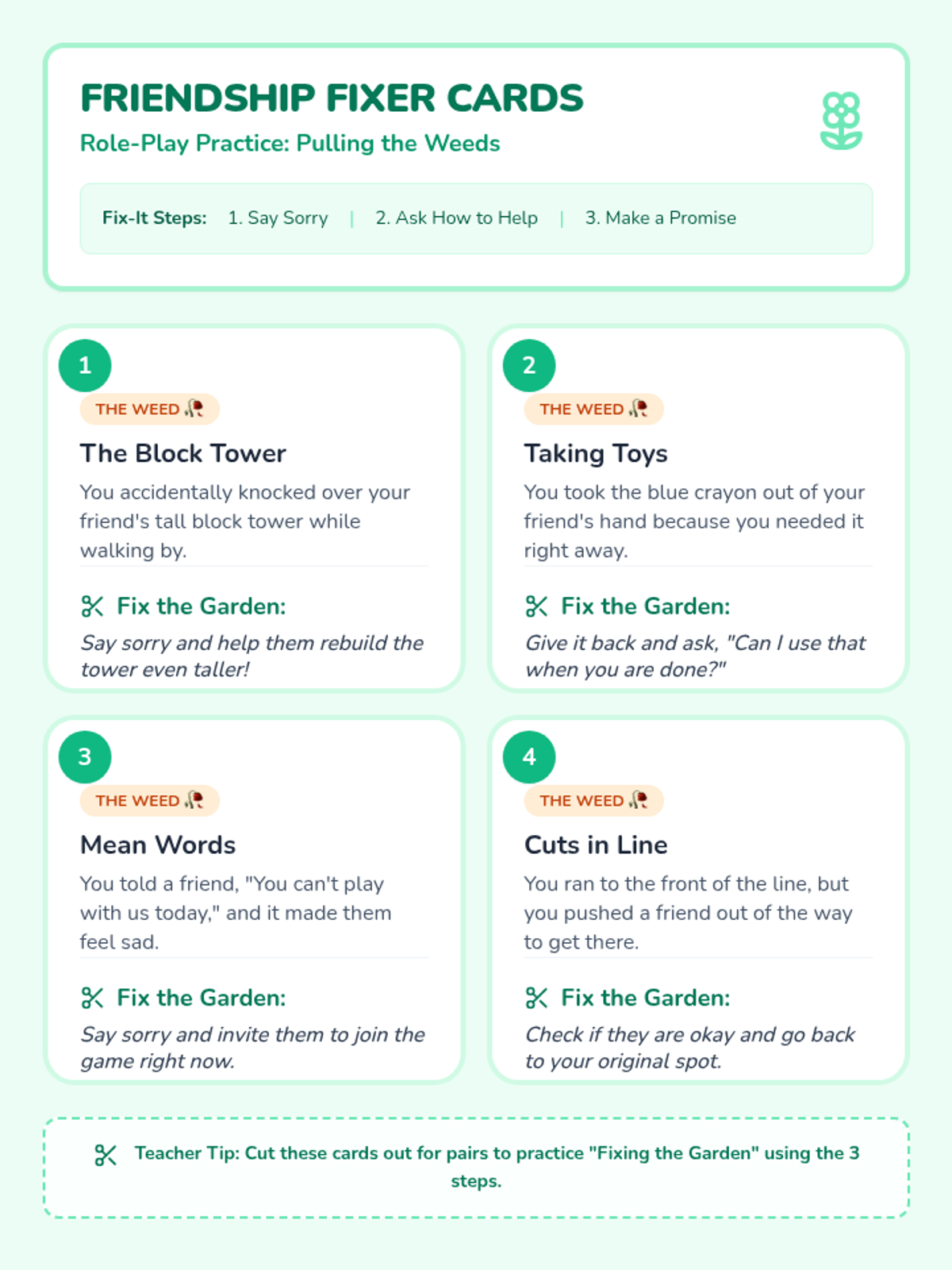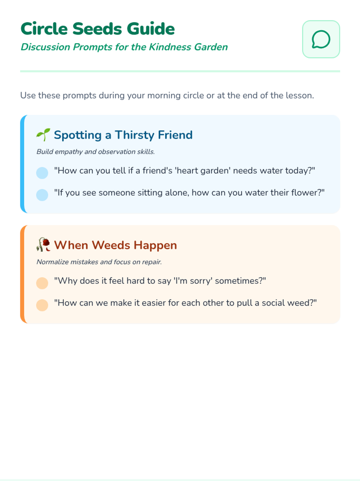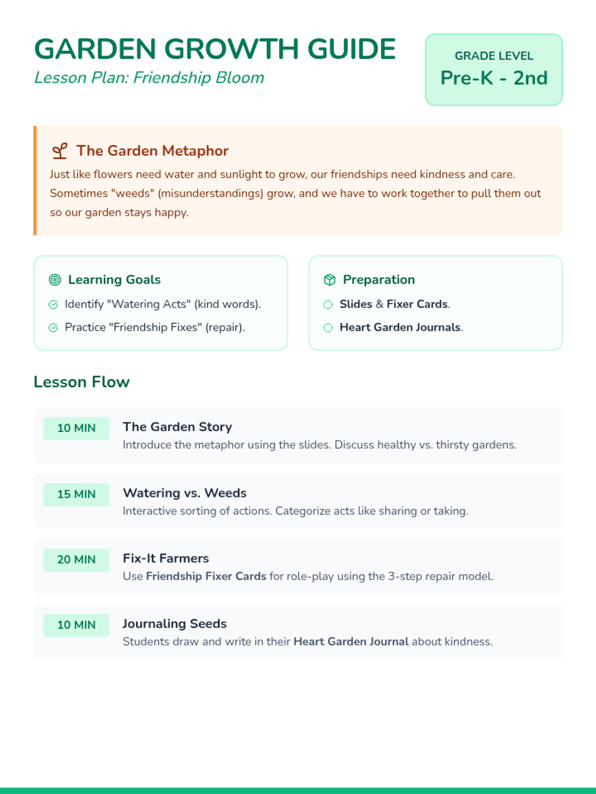 An SEL lesson for Pre-K to 2nd grade that uses a garden metaphor to teach kindness, social repair, and the impact of our actions on others. Students learn to 'water' friendships with kind acts and 'pull weeds' by fixing misunderstandings.
