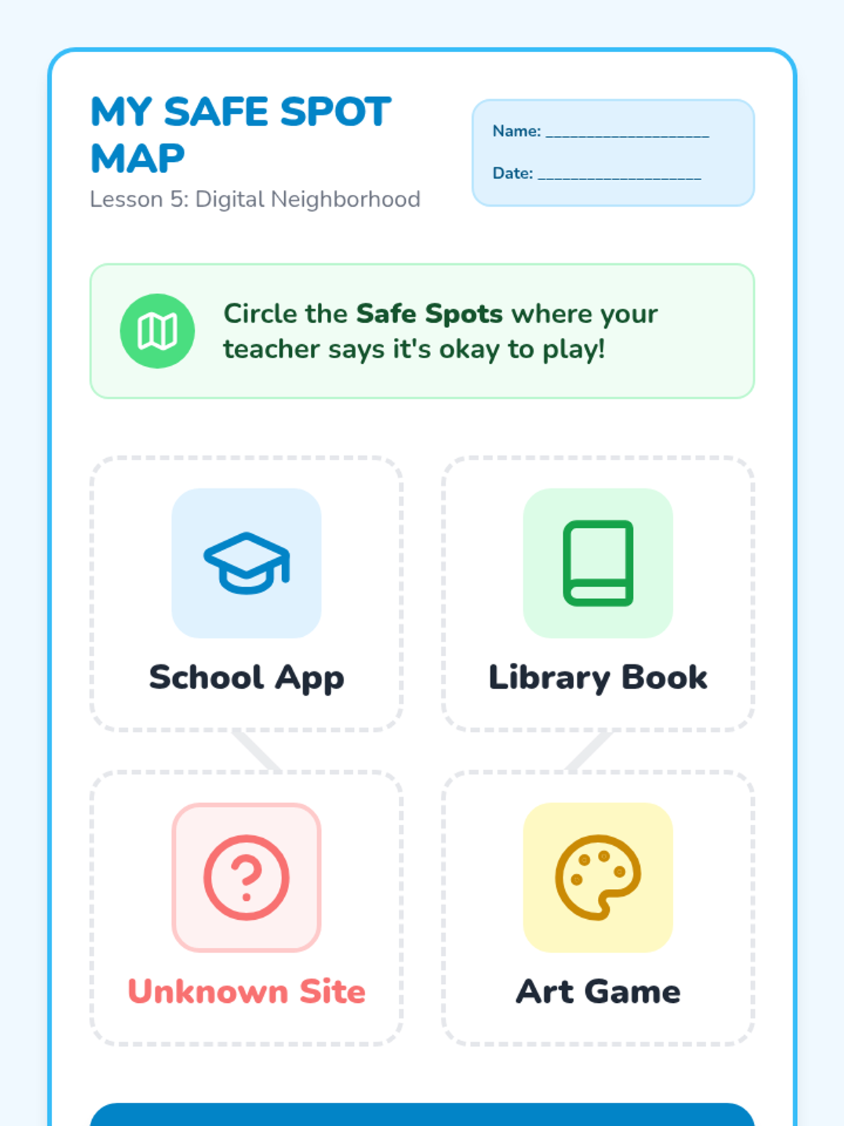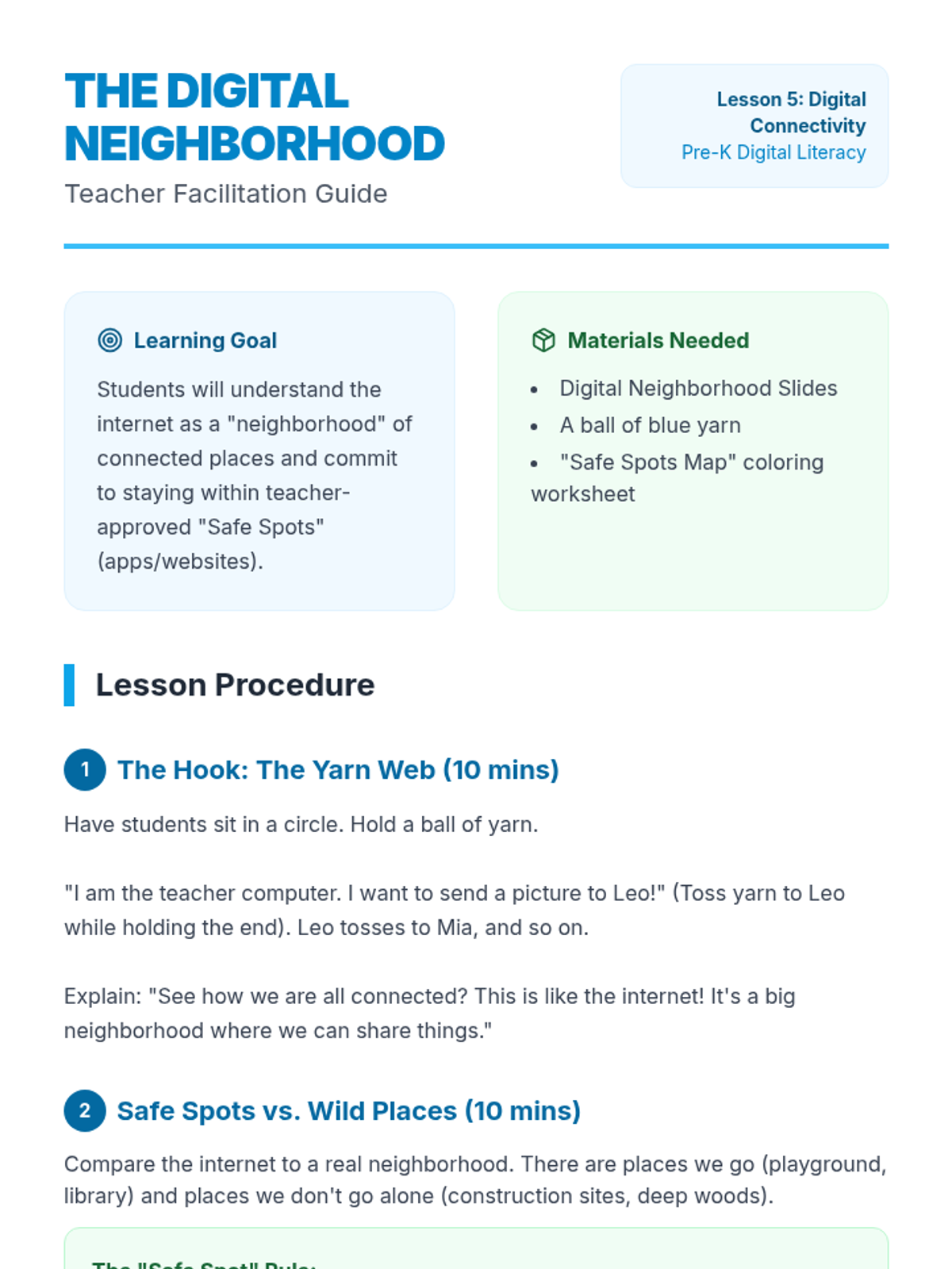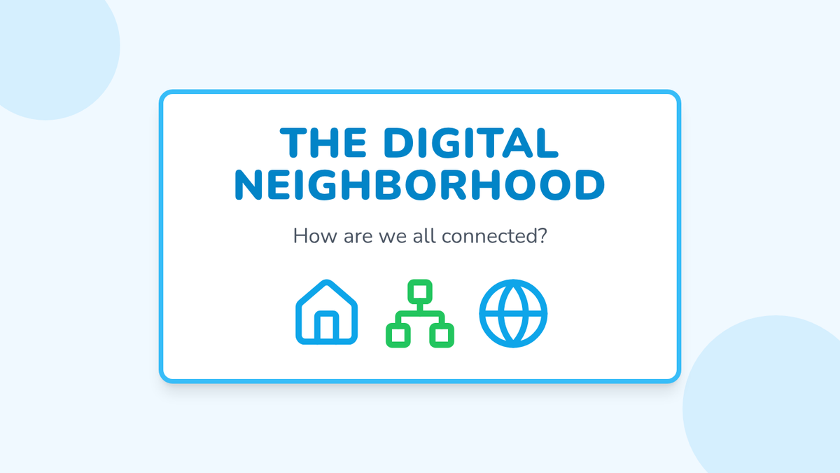 Provides a basic mental model of how devices connect us to a 'digital neighborhood' and the importance of staying in teacher-approved 'safe places'.