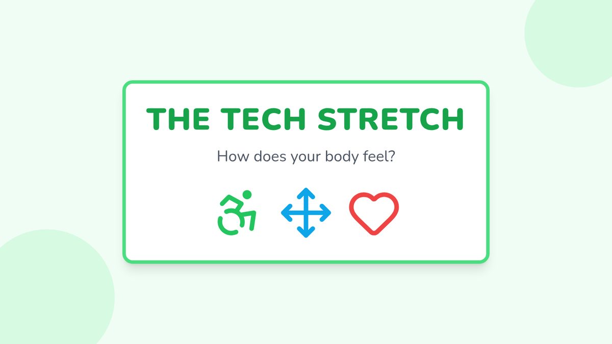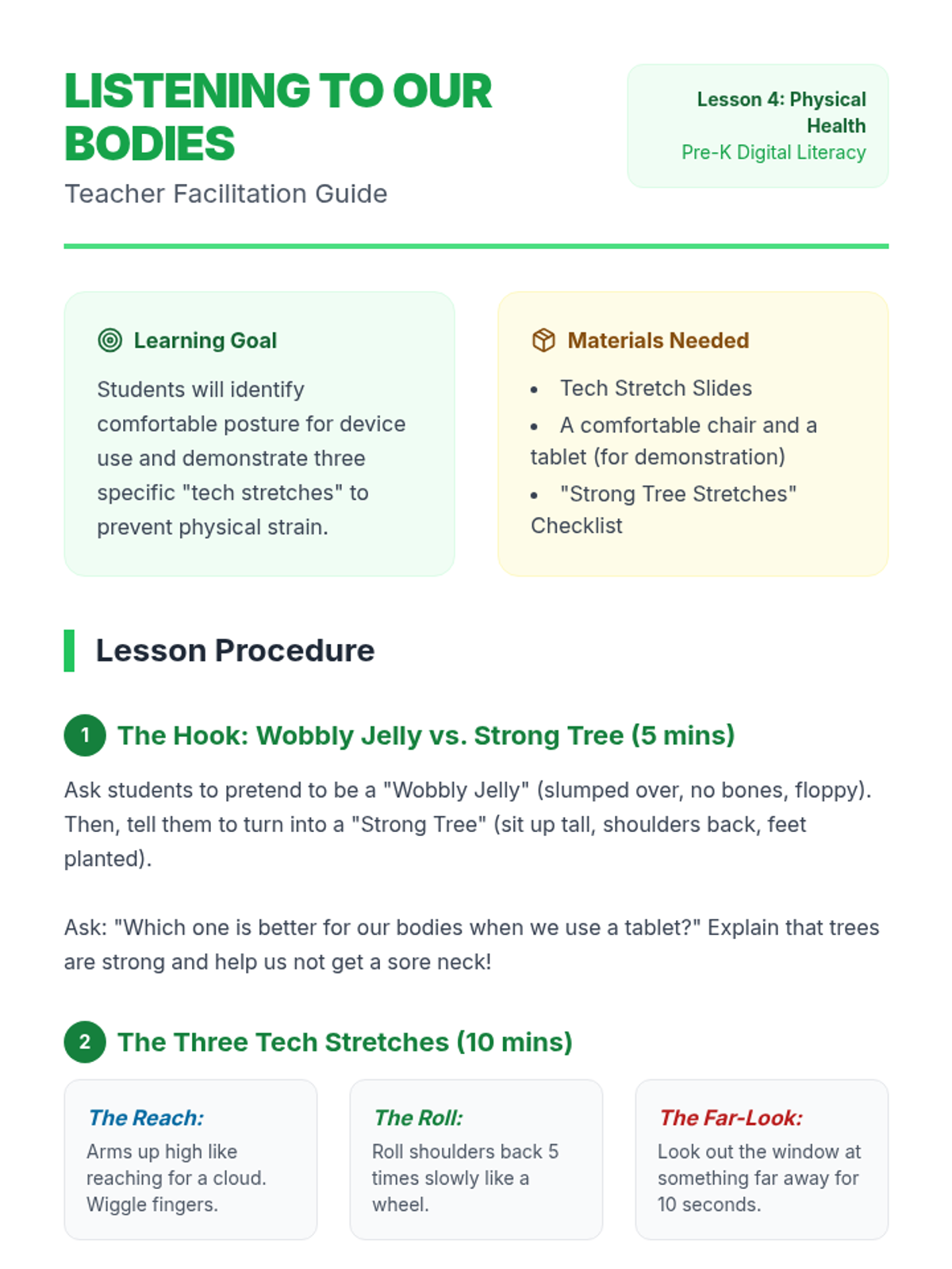 Introduces physical health habits related to technology use, including proper posture and the importance of taking movement breaks.