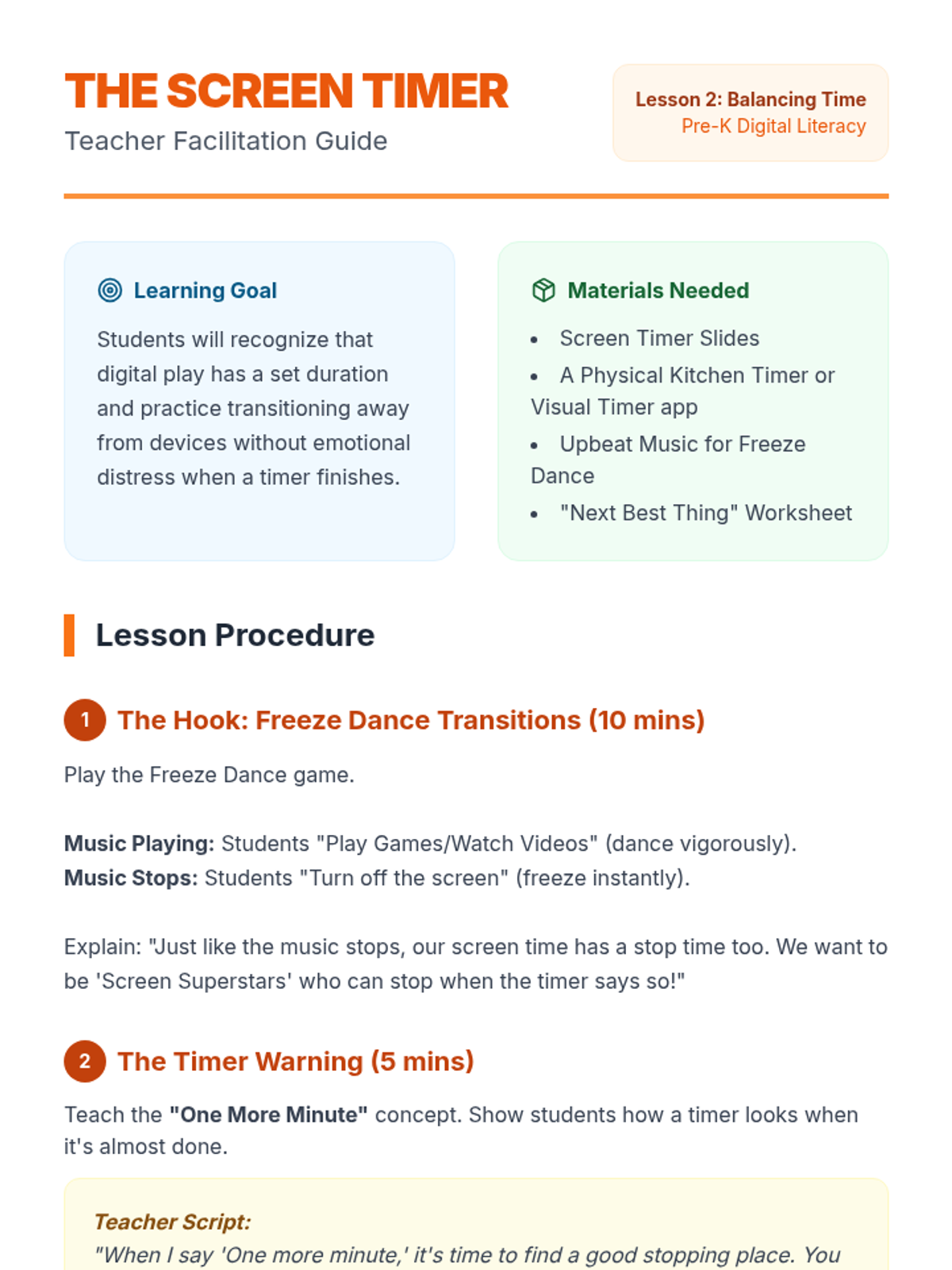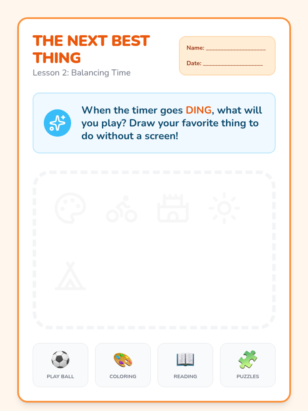 Focuses on self-regulation and time awareness by practicing transitions from digital devices to other activities using timers and games.