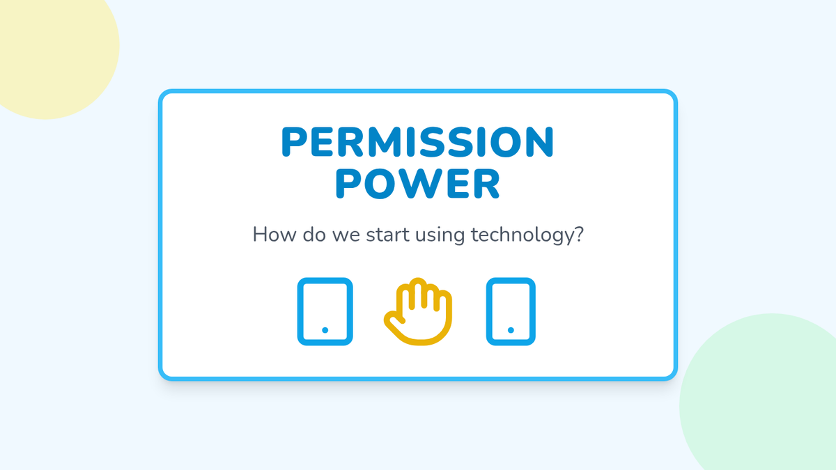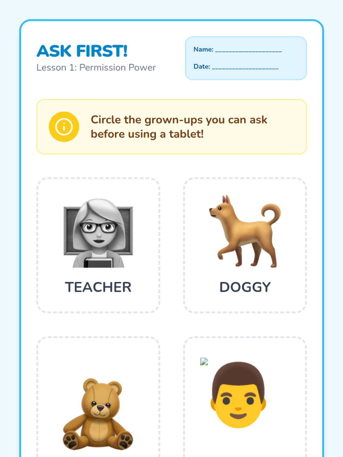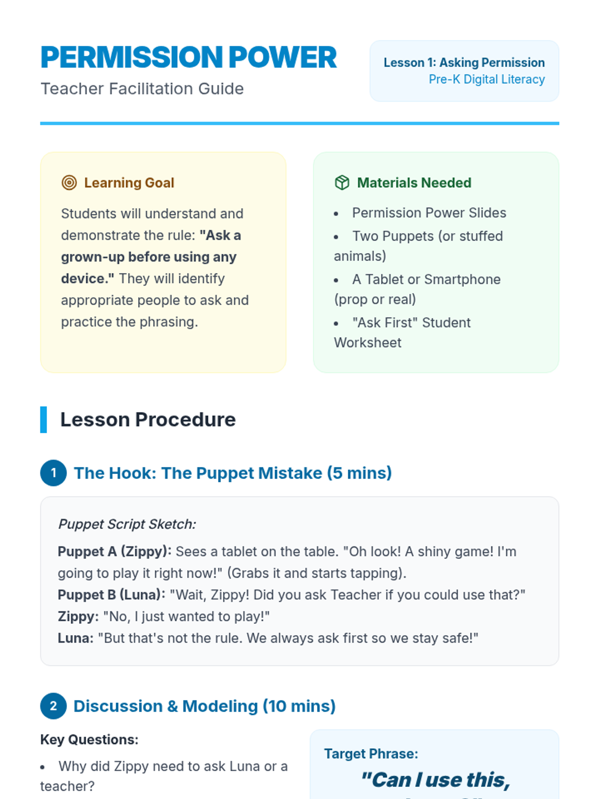 Students learn the fundamental rule of asking a trusted adult for permission before using any digital device through puppet modeling and discussion.