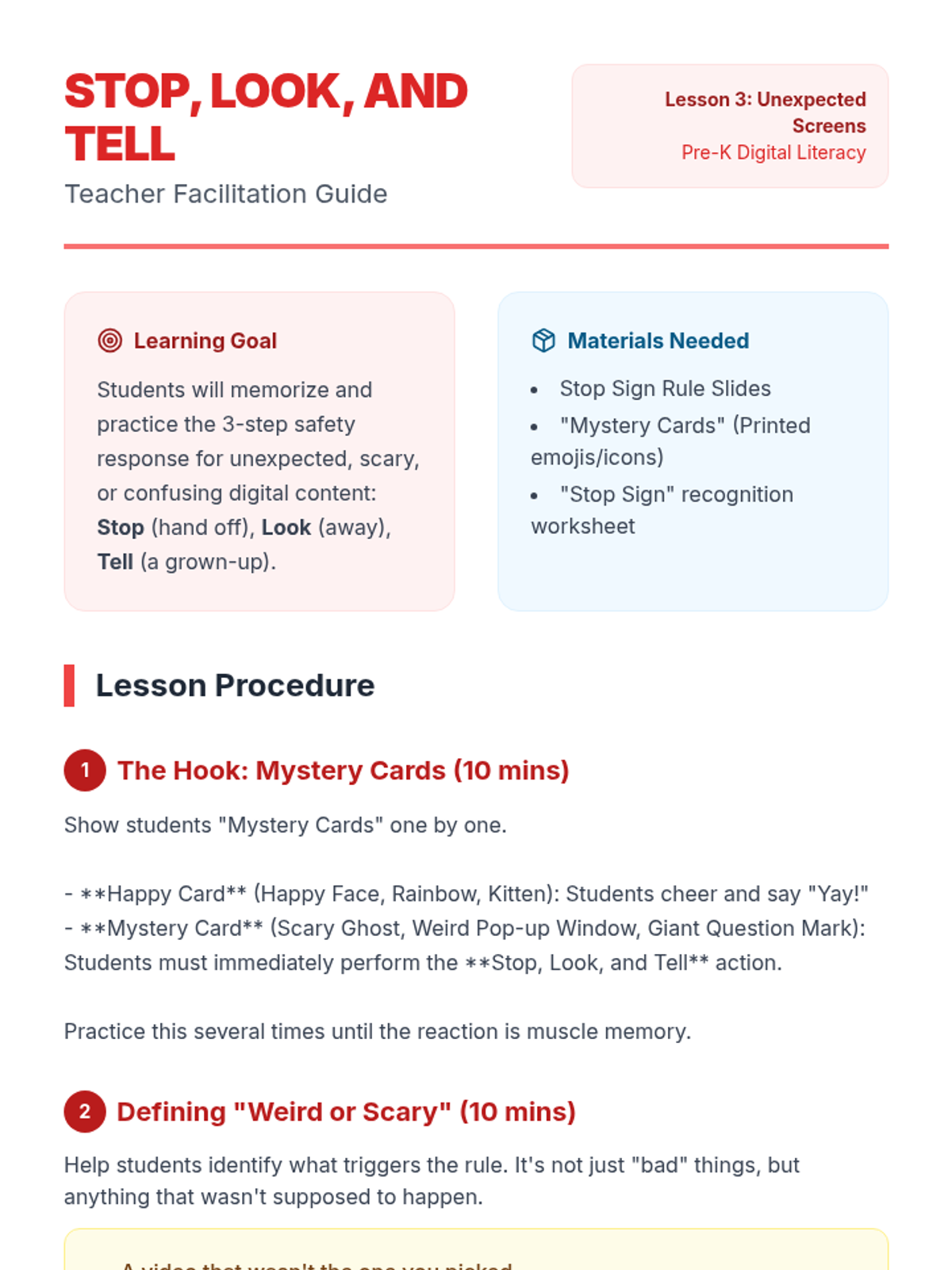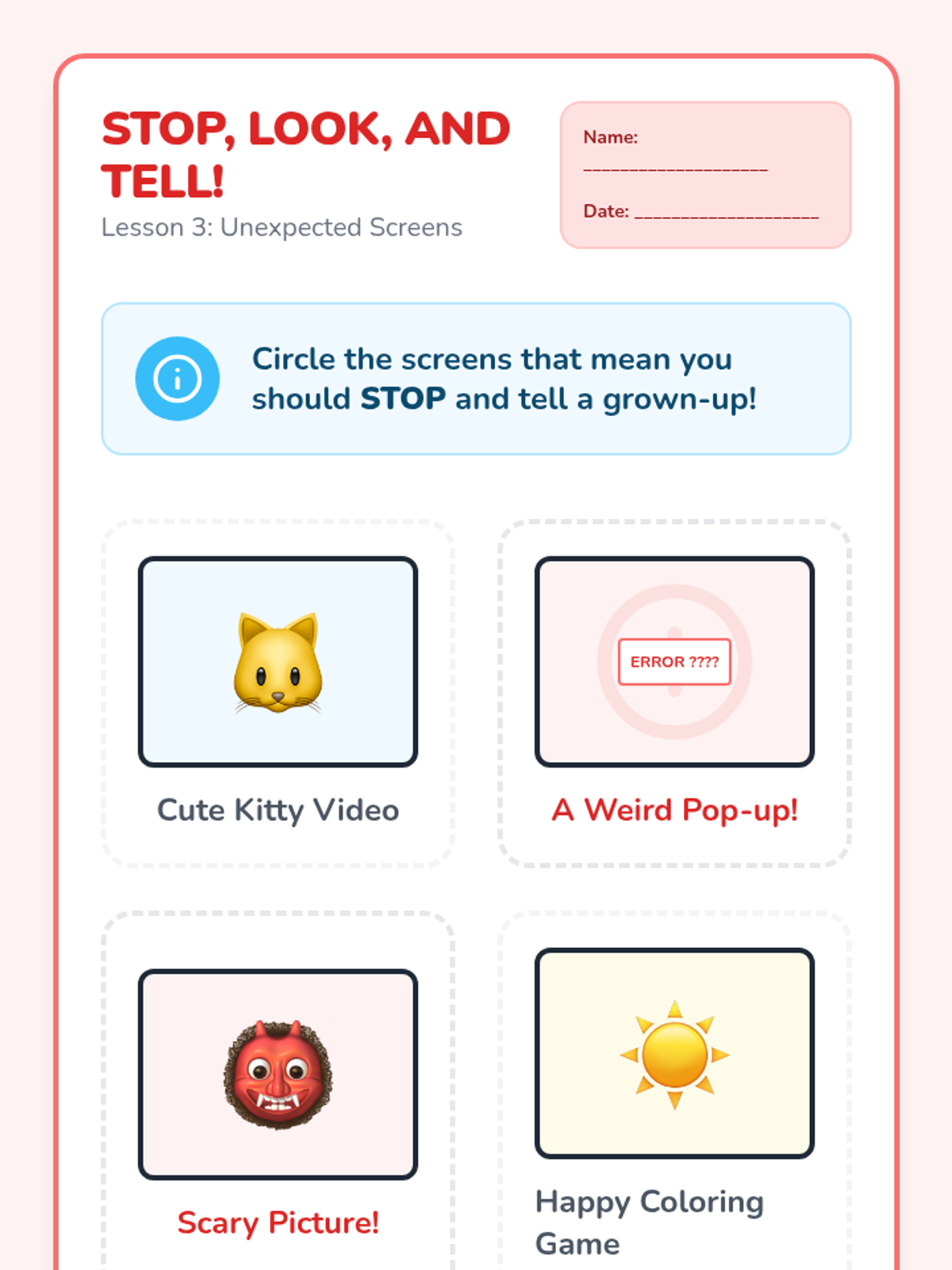 Teaches students the 'Stop, Look, and Tell' protocol for when they encounter unexpected, confusing, or scary content on a screen.