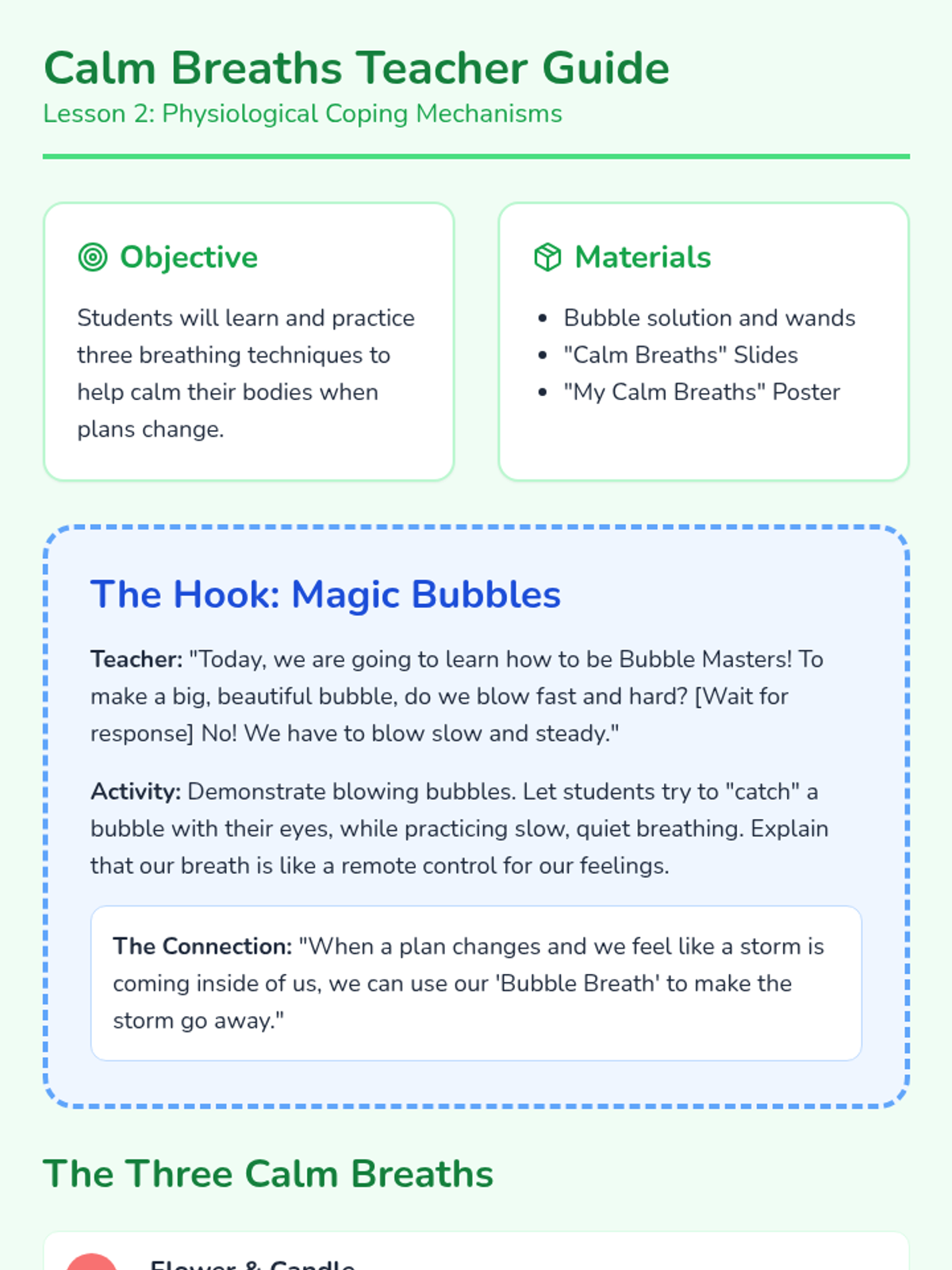 Focuses on emotional regulation strategies like 'Stop, Breathe, Pick a New Way' to handle the frustration of change.