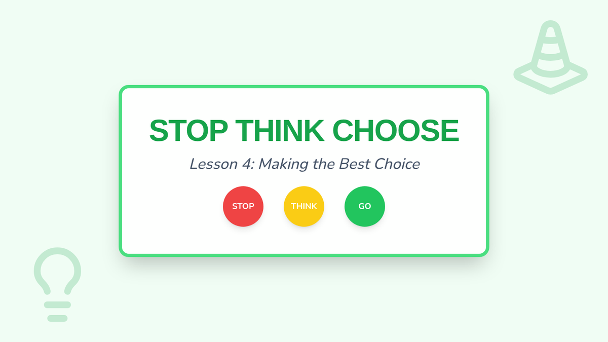 Students practice the 'Stop, Think, Choose' strategy through guided role-play scenarios involving sharing and turn-taking. They are presented with a social problem and offered two distinct choices, visually represented by red (stop/bad choice) and green (go/good choice) signals.