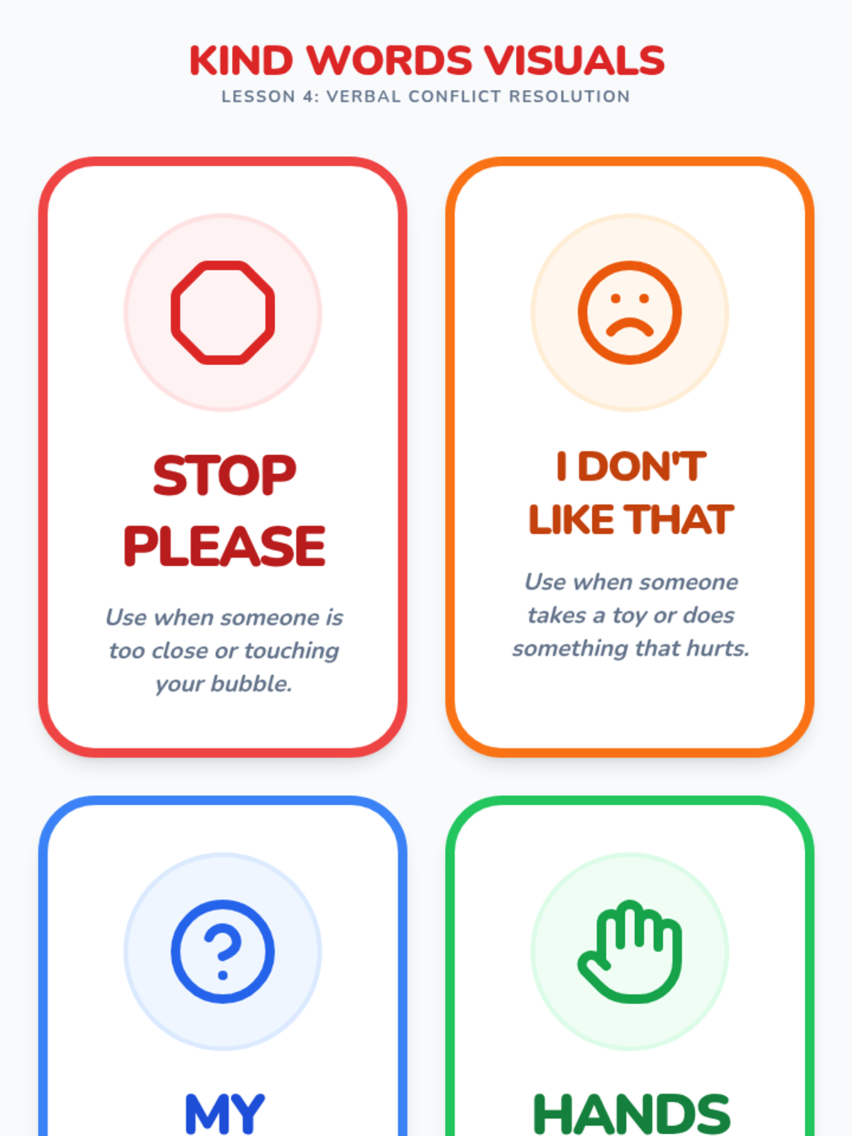 Students practice using verbal scripts like 'Stop please' and 'I don't like that' as alternatives to physical reactions during conflict.