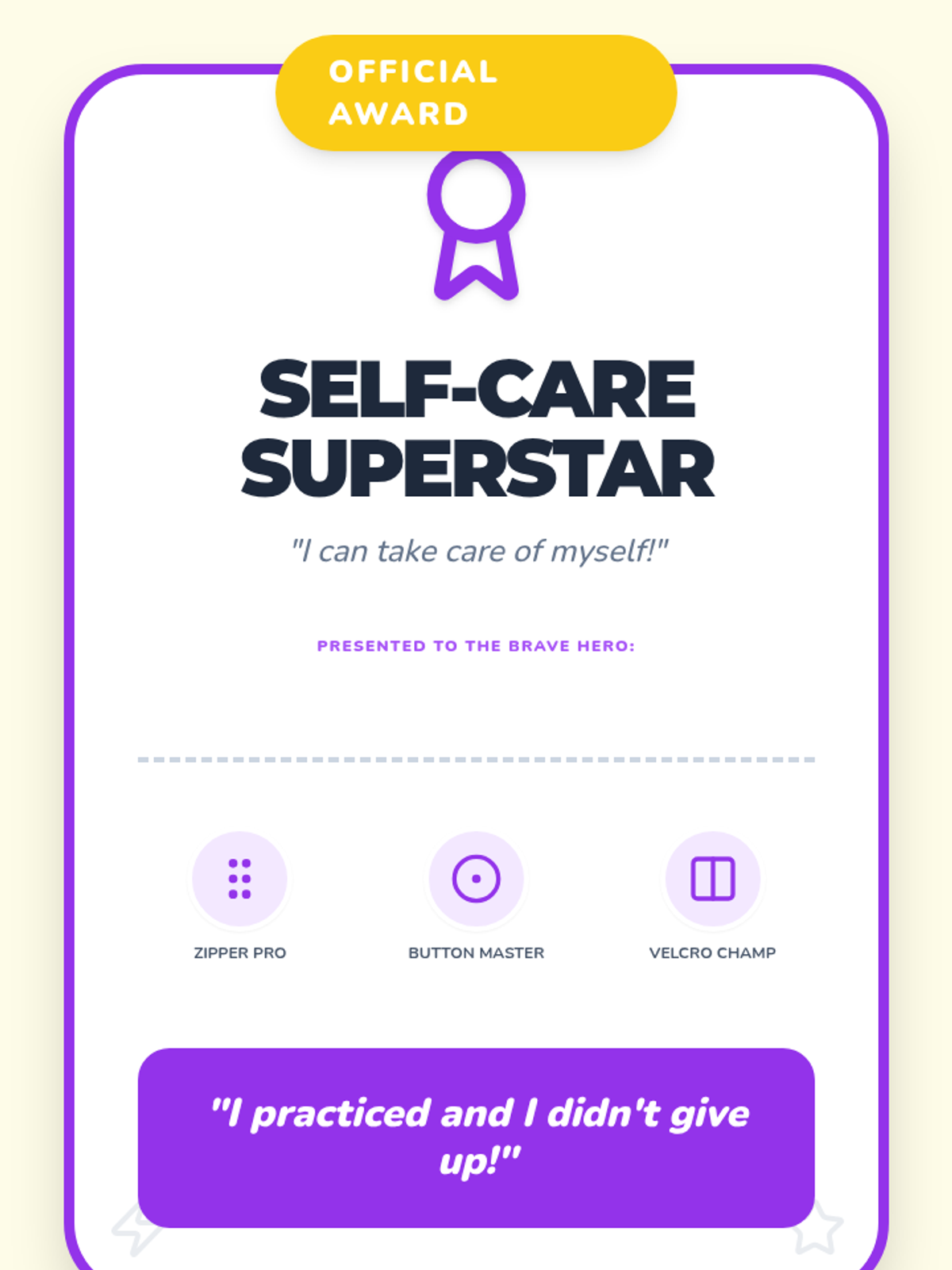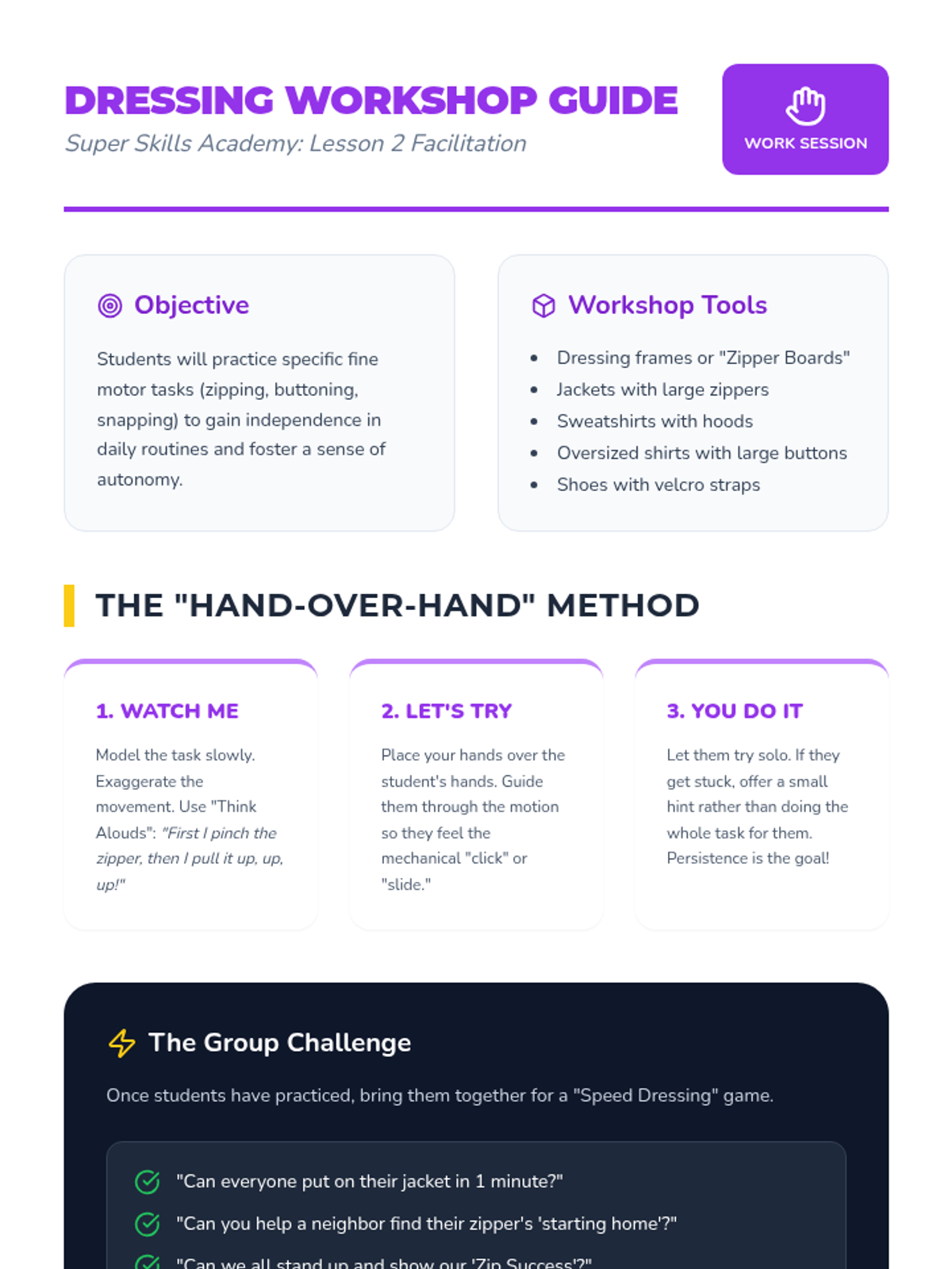 A hands-on workshop where students practice zippers, buttons, and other self-care tasks to build fine motor skills and autonomy.