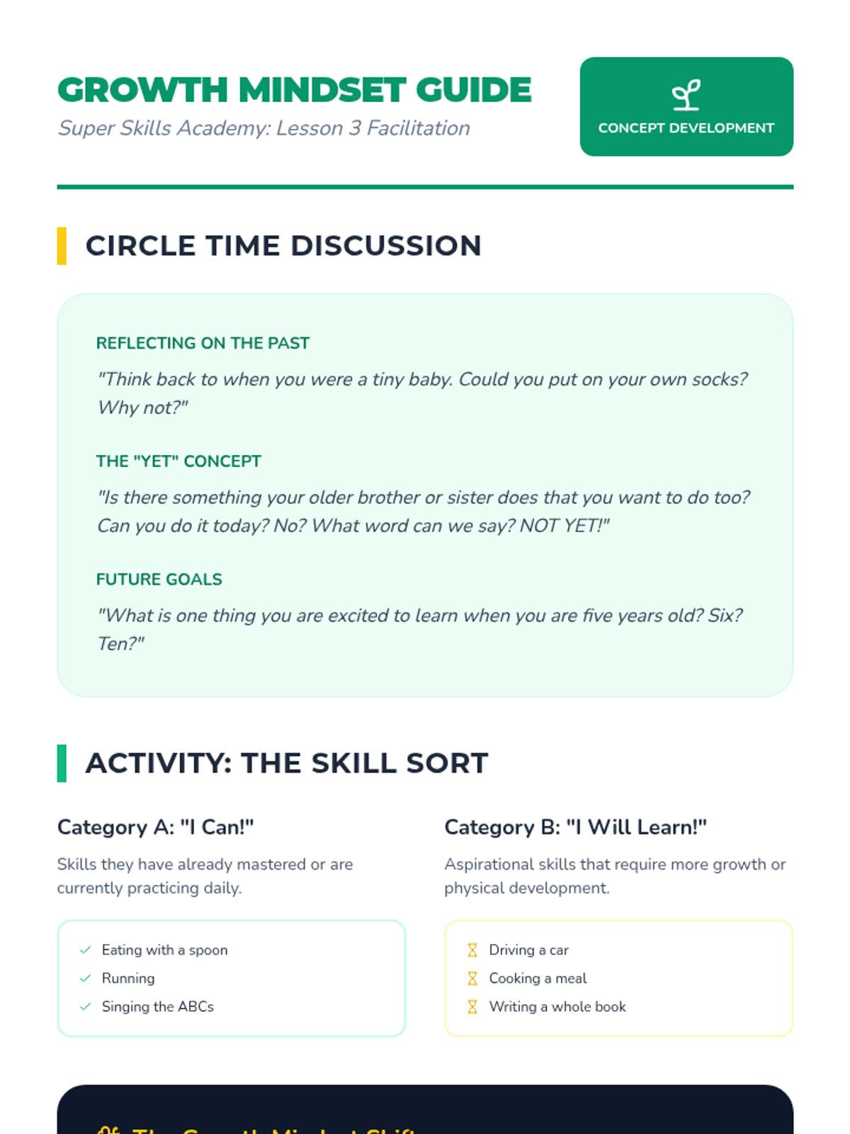 Introduction to the growth mindset using the word 'yet' to transform frustrations into future goals.