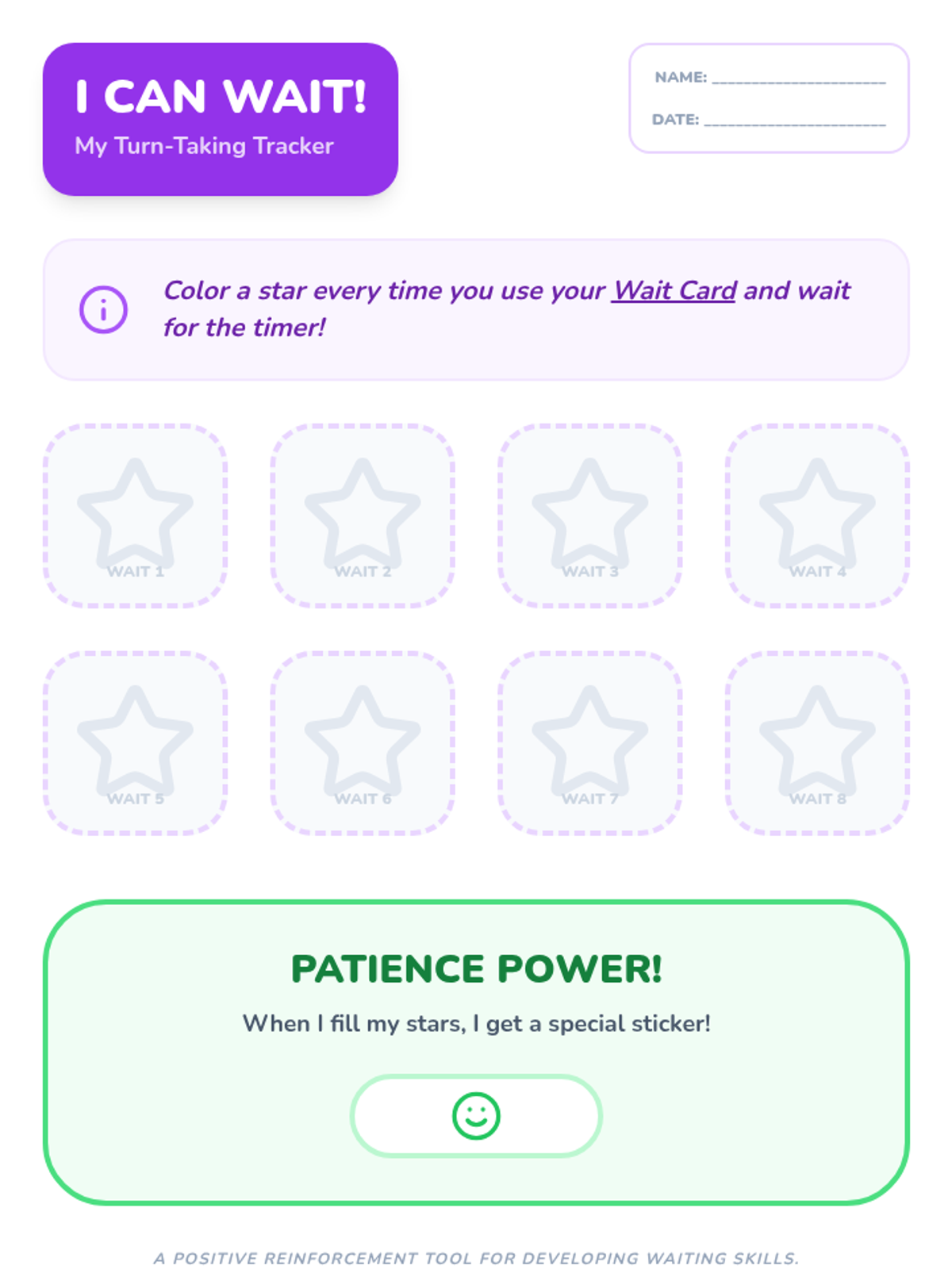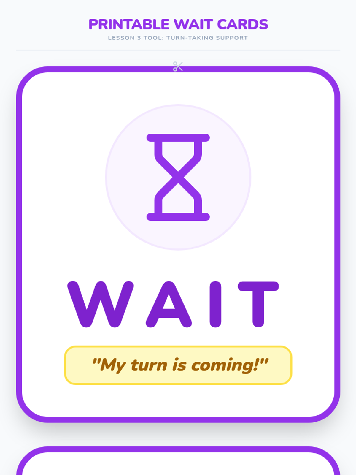 Students explore a social story about waiting and turn-taking, using visual 'wait cards' and timers to build patience.