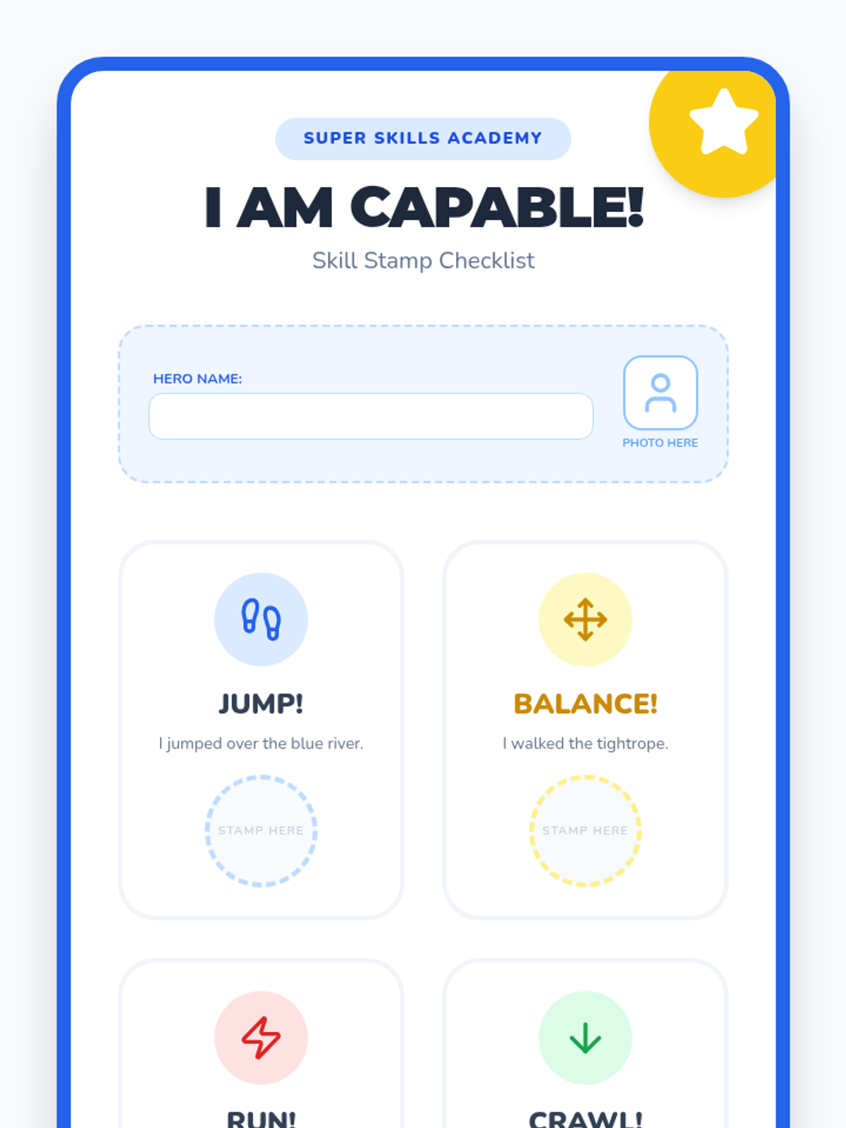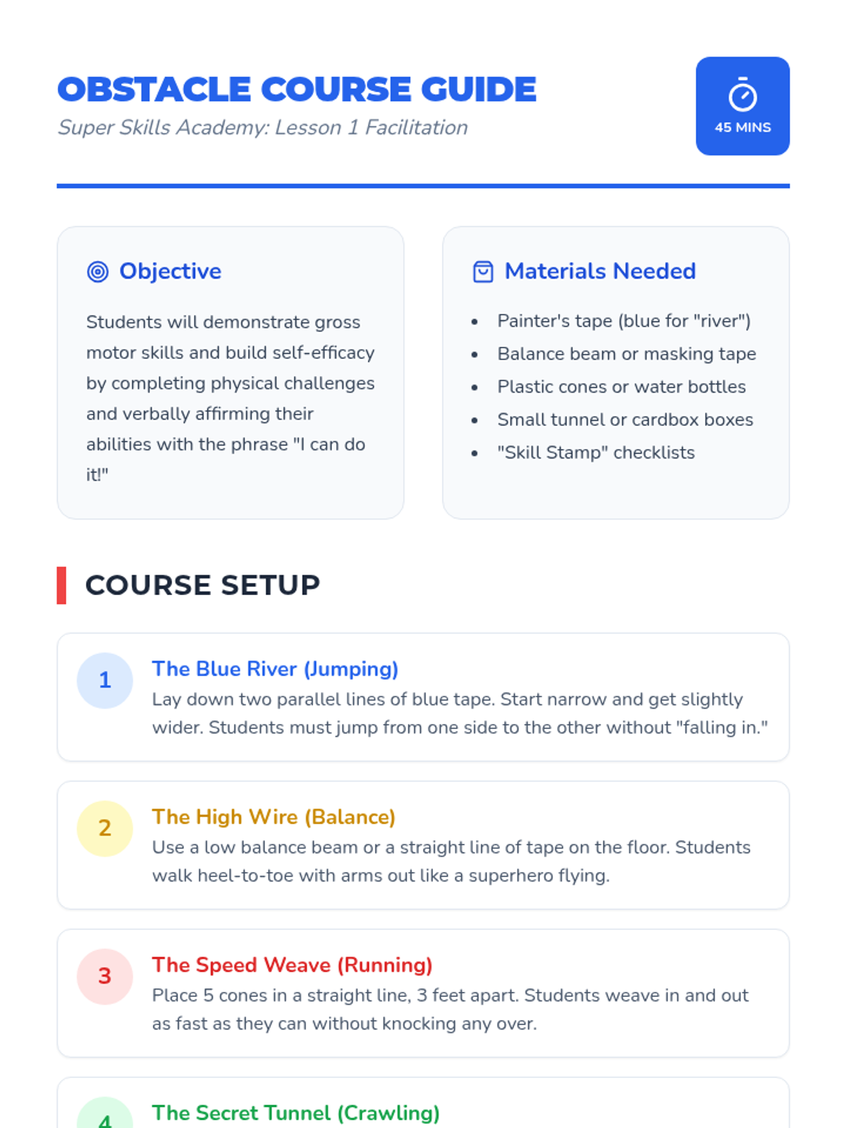 Students explore their physical capabilities through an obstacle course, practicing self-affirmation and gross motor skills.