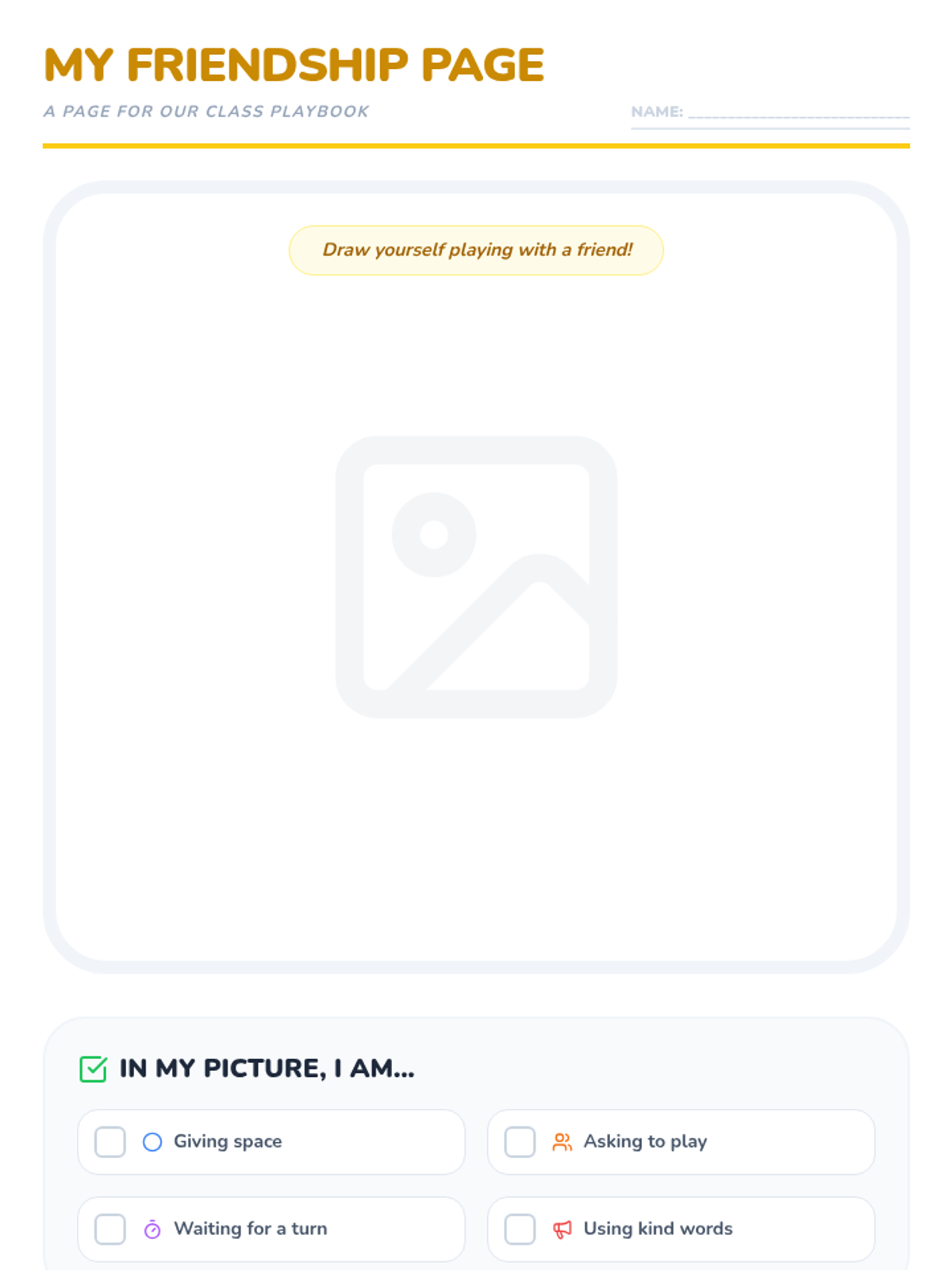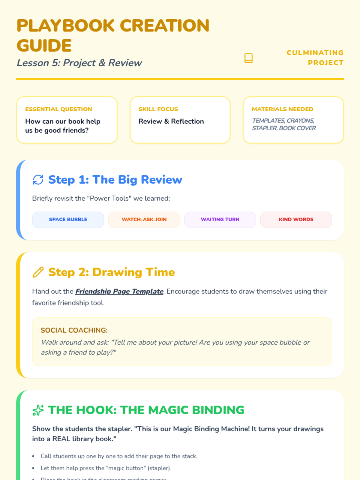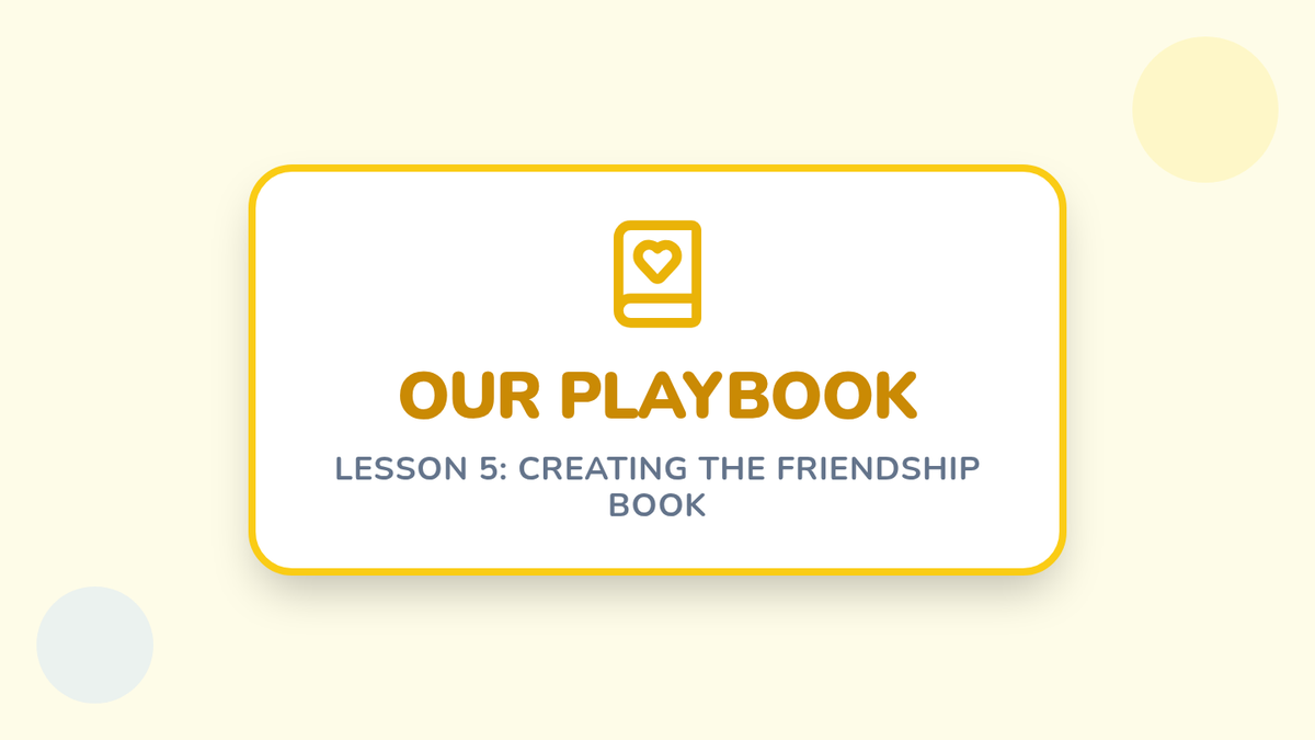 Students create and present a page for the class 'Friendship Playbook', reflecting on their favorite social skill.