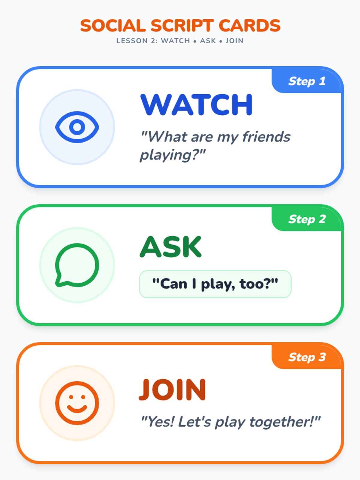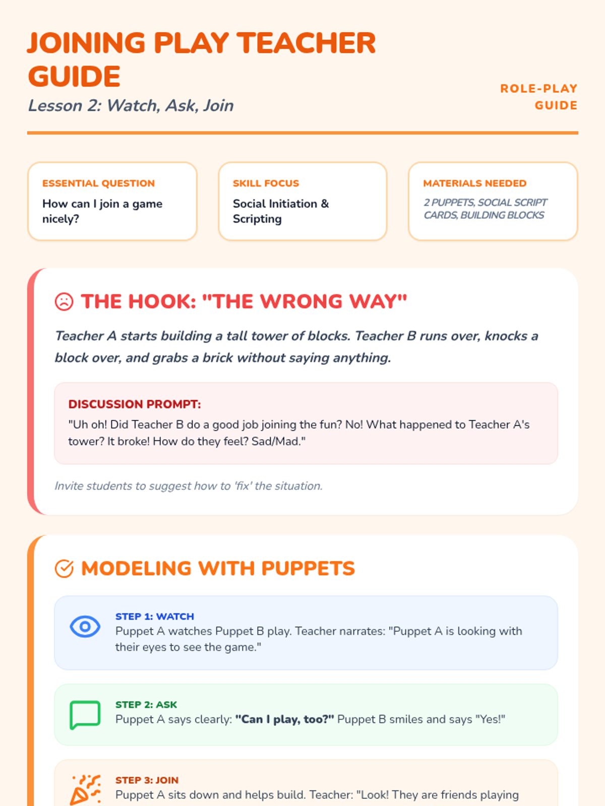 Students learn and practice the 'Watch, Ask, Join' script for entering social play situations respectfully using puppets.
