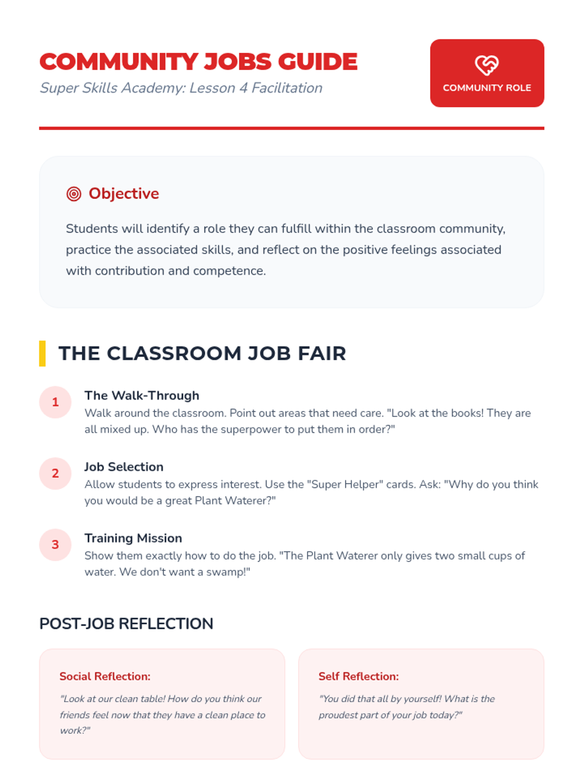 Students take on classroom responsibilities to understand their role in a community and the satisfaction of contributing.