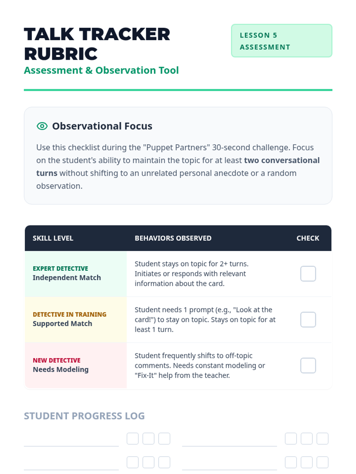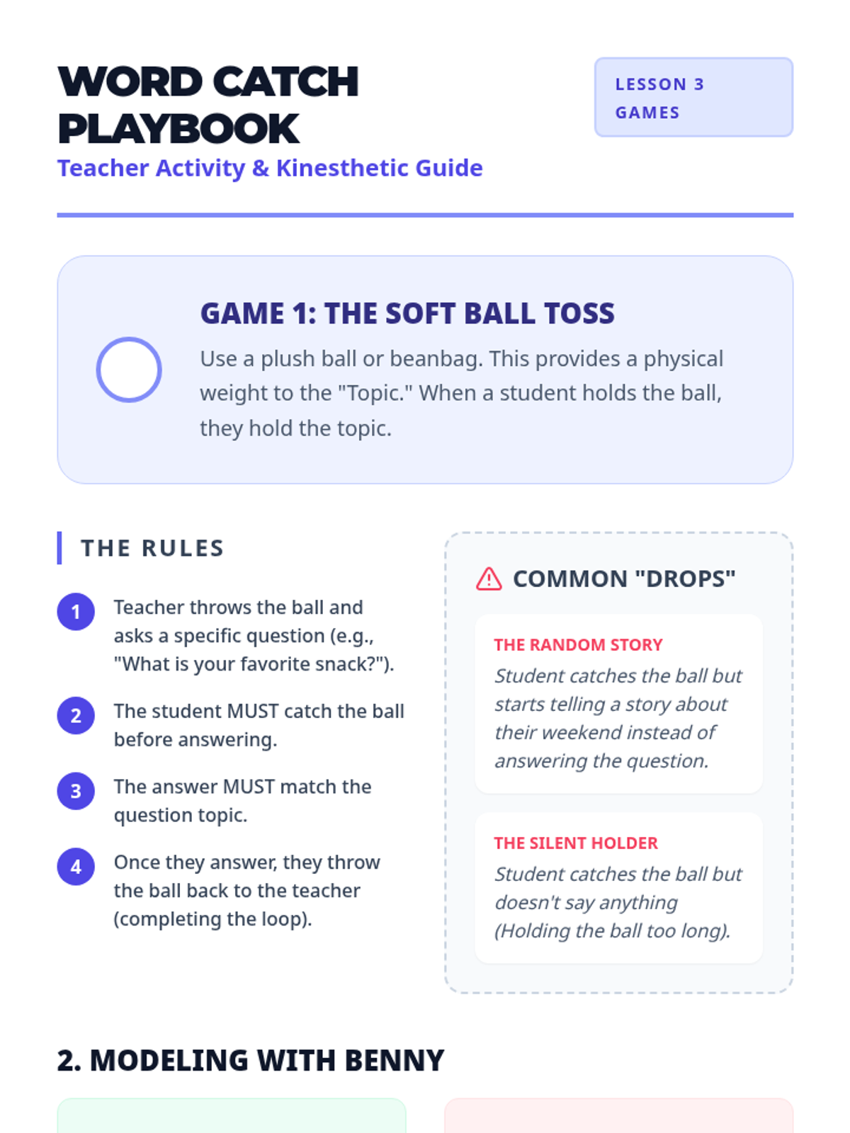 Students meet Benny the Bear, a puppet who gets mixed up about topics, and practice identifying off-topic comments using a physical 'Stop' sign.