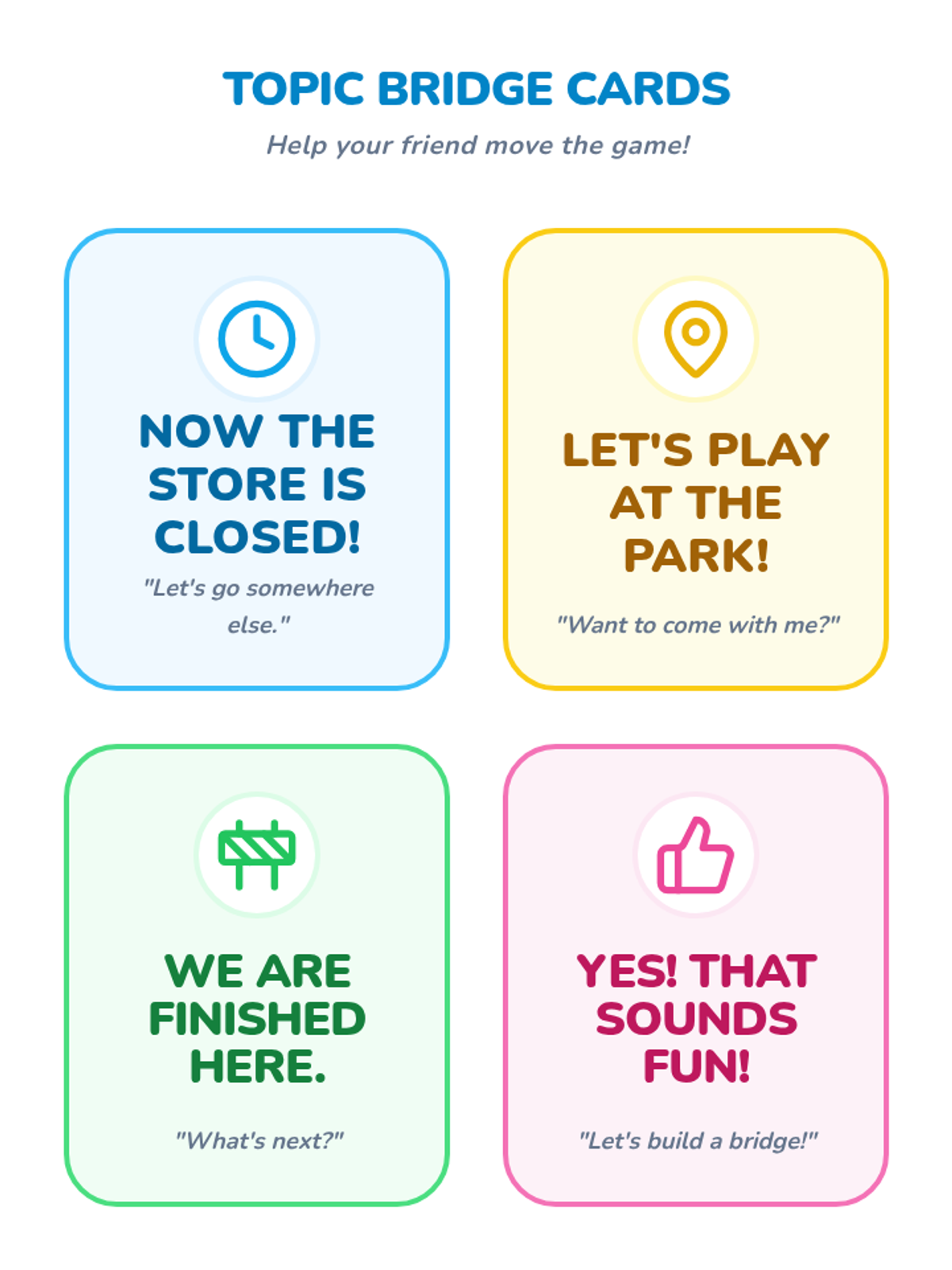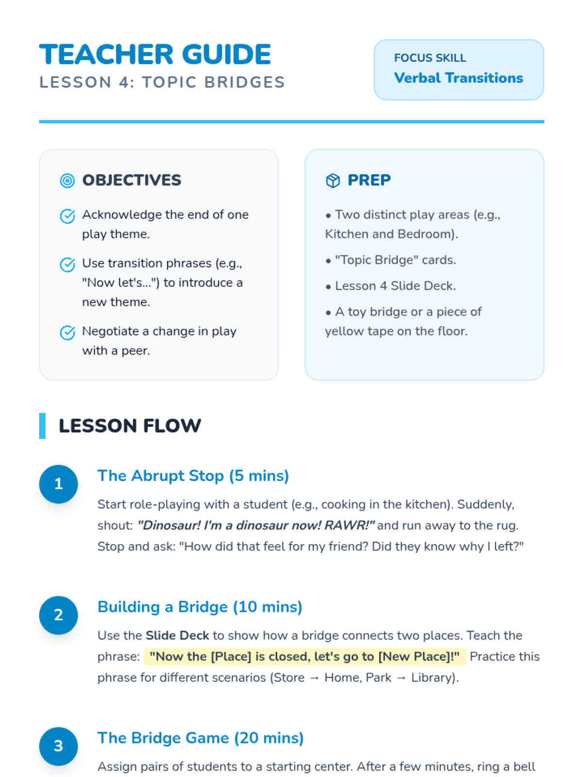 Students learn how to shift play themes naturally. Instead of abruptly changing games, they practice saying, 'Let's change to...' or 'Now the store is closed, let's go to the park,' treating the transition as a bridge.