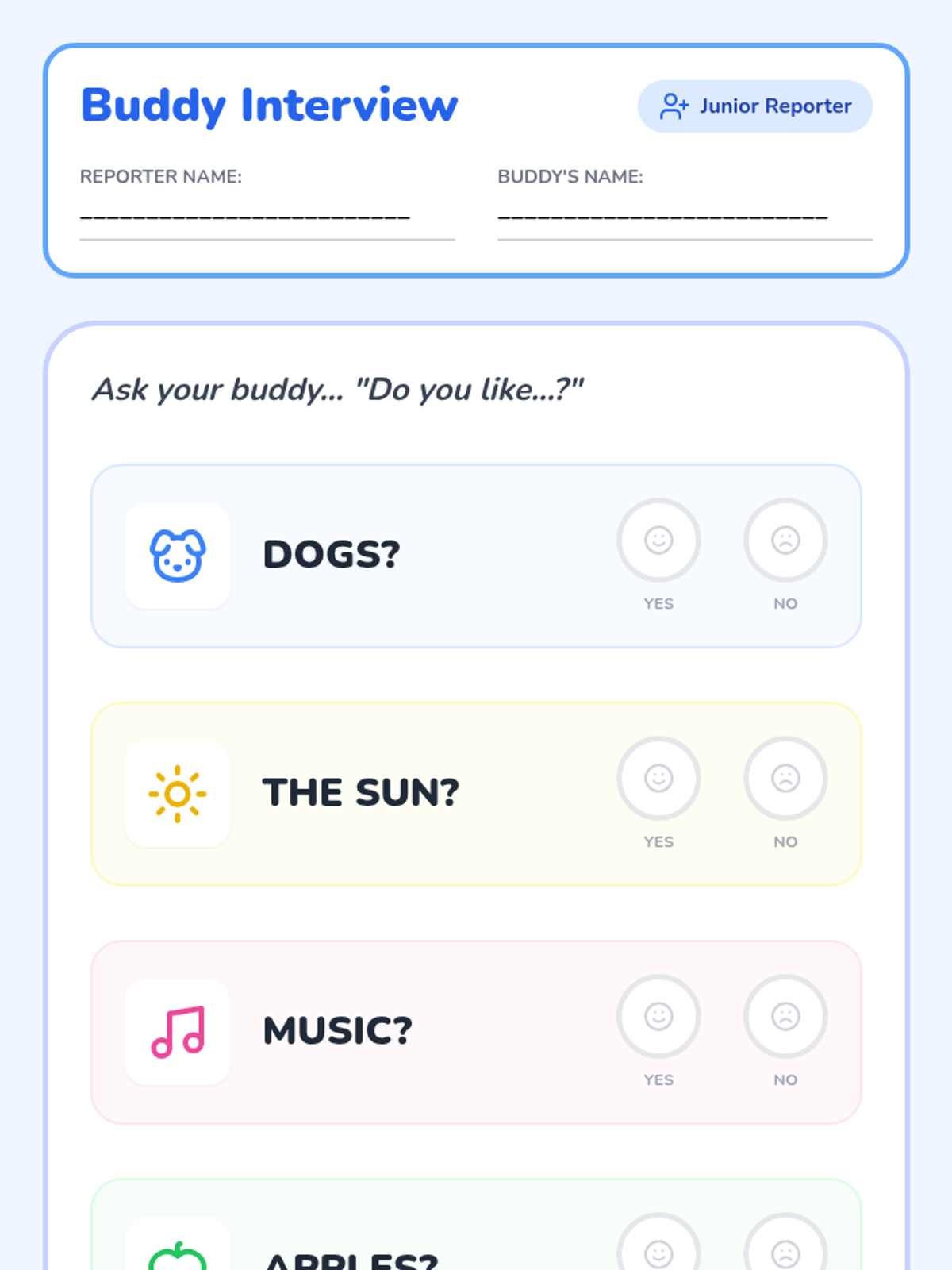 Students work in pairs to interview a friend about their likes and dislikes, discovering common ground and unique traits.