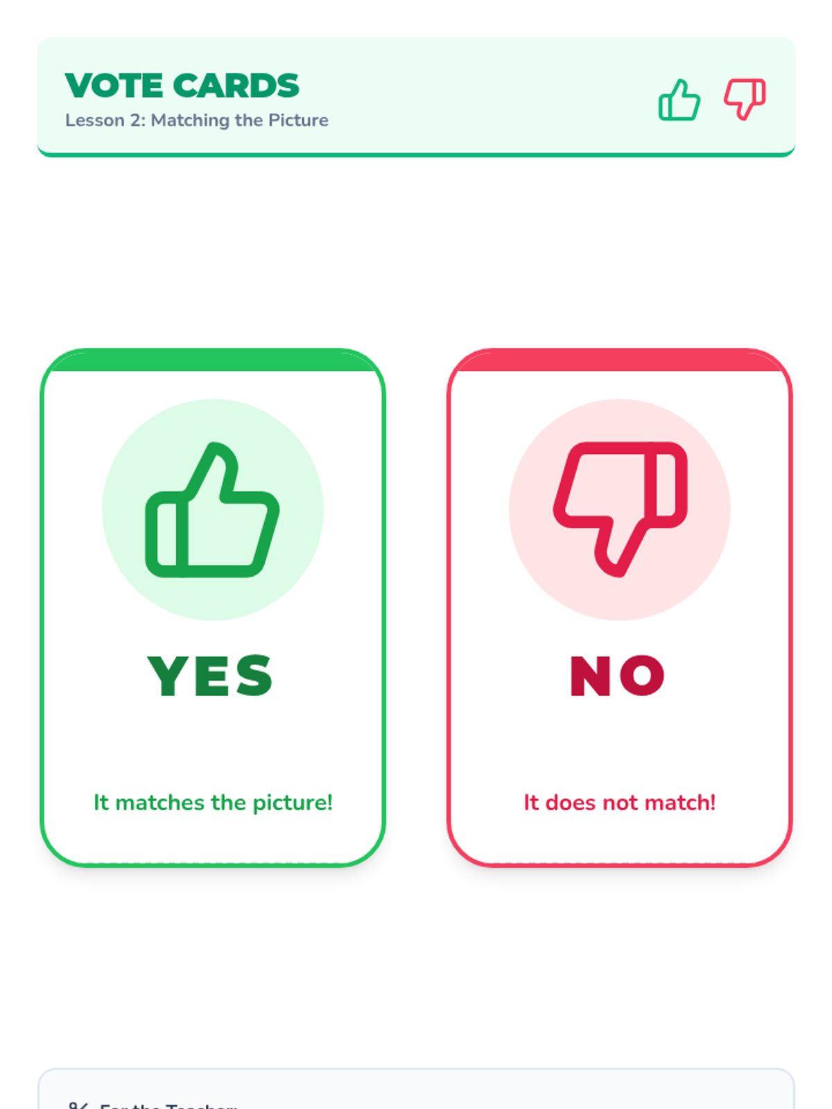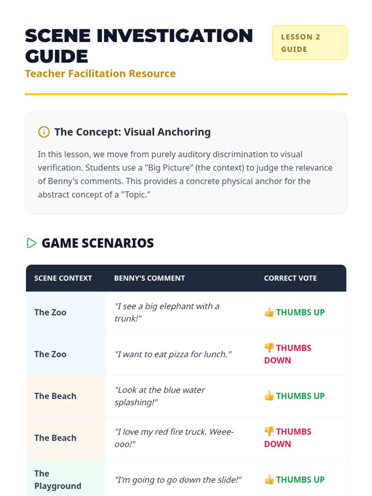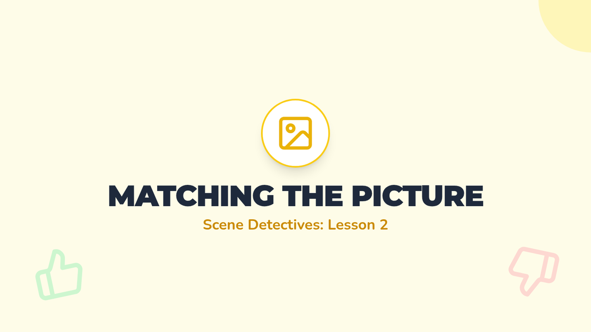 Students use visual scenes to judge whether the puppet's comments match the visible context, using 'Thumbs Up' and 'Thumbs Down' to vote.