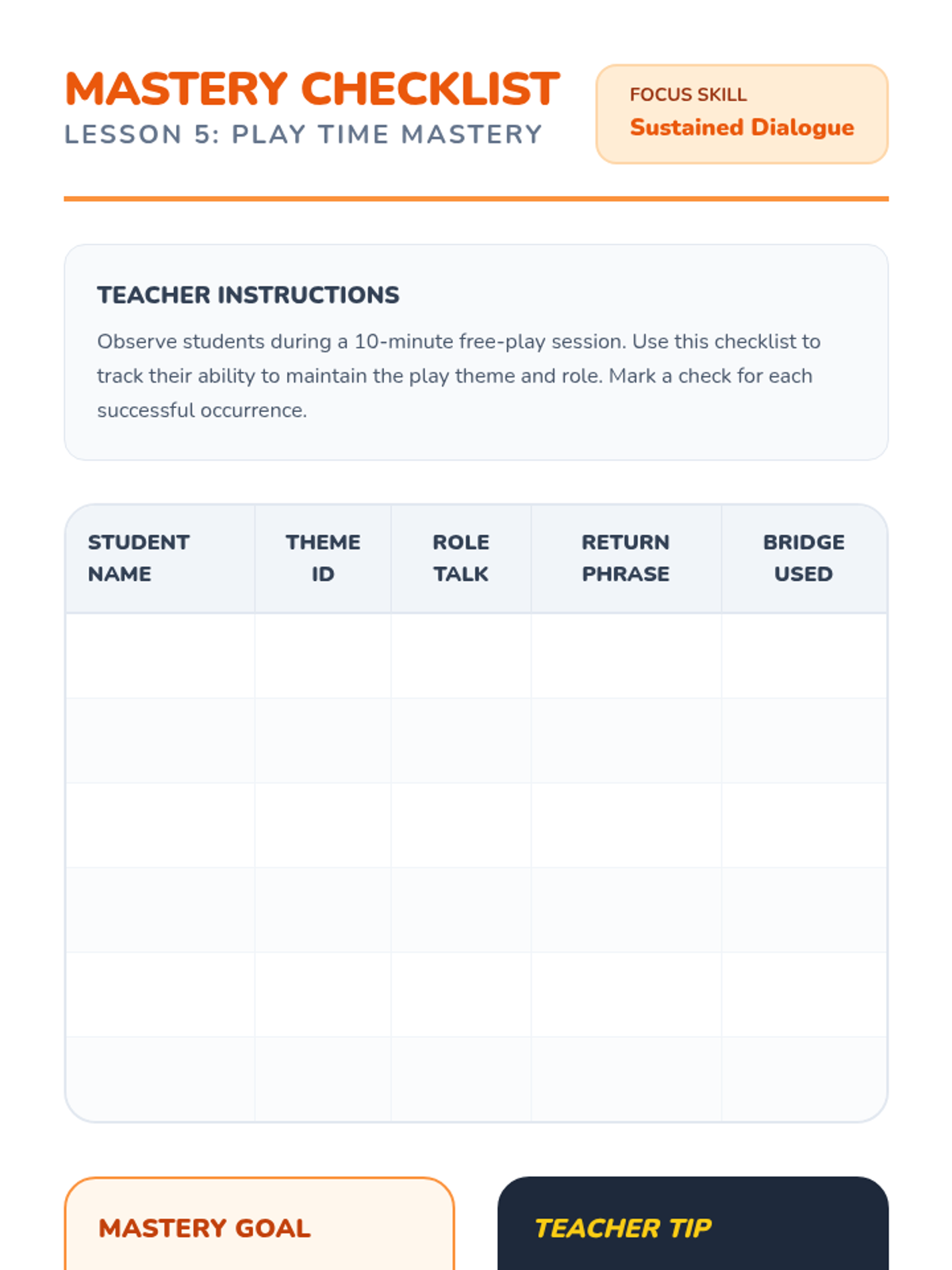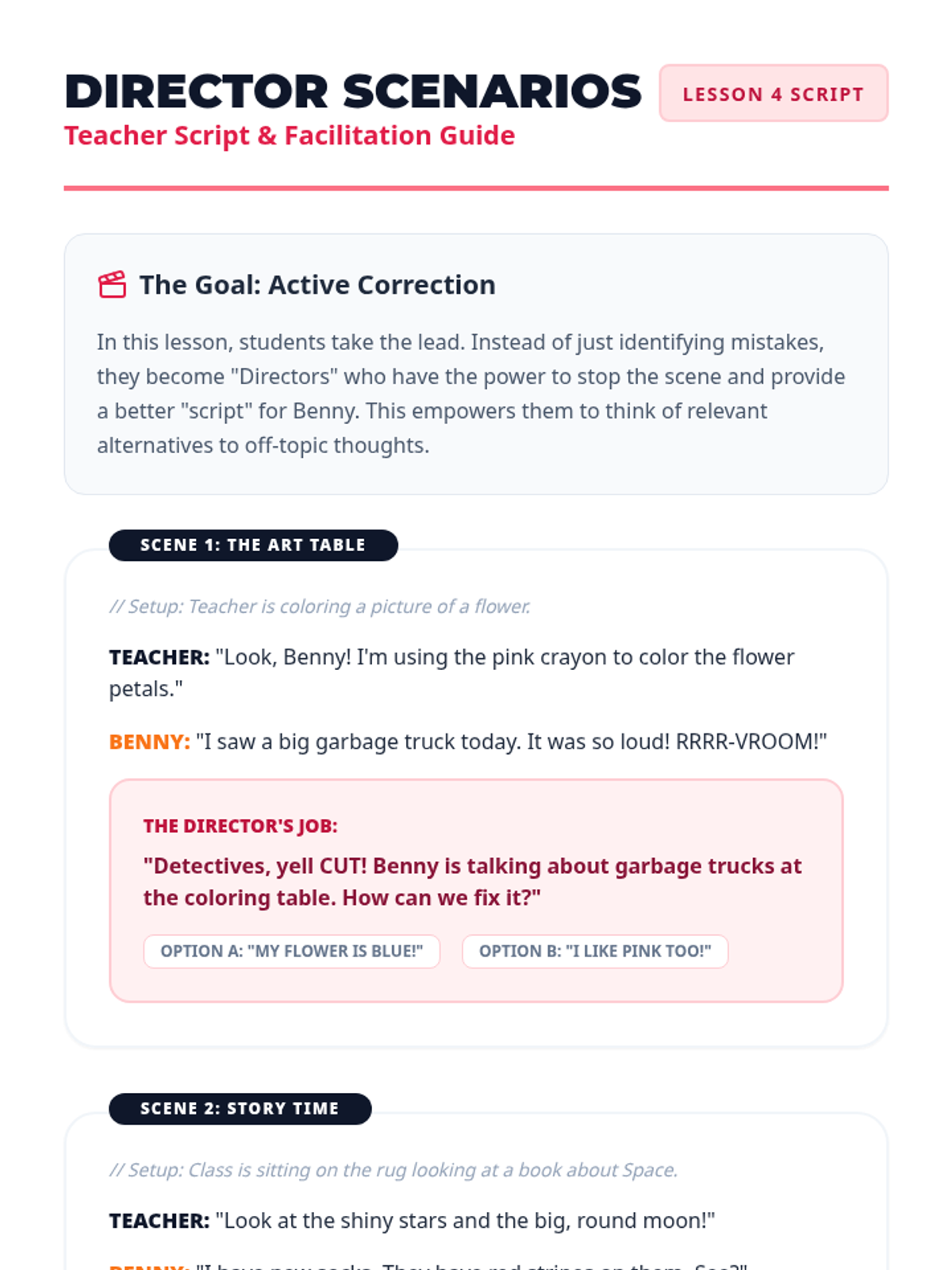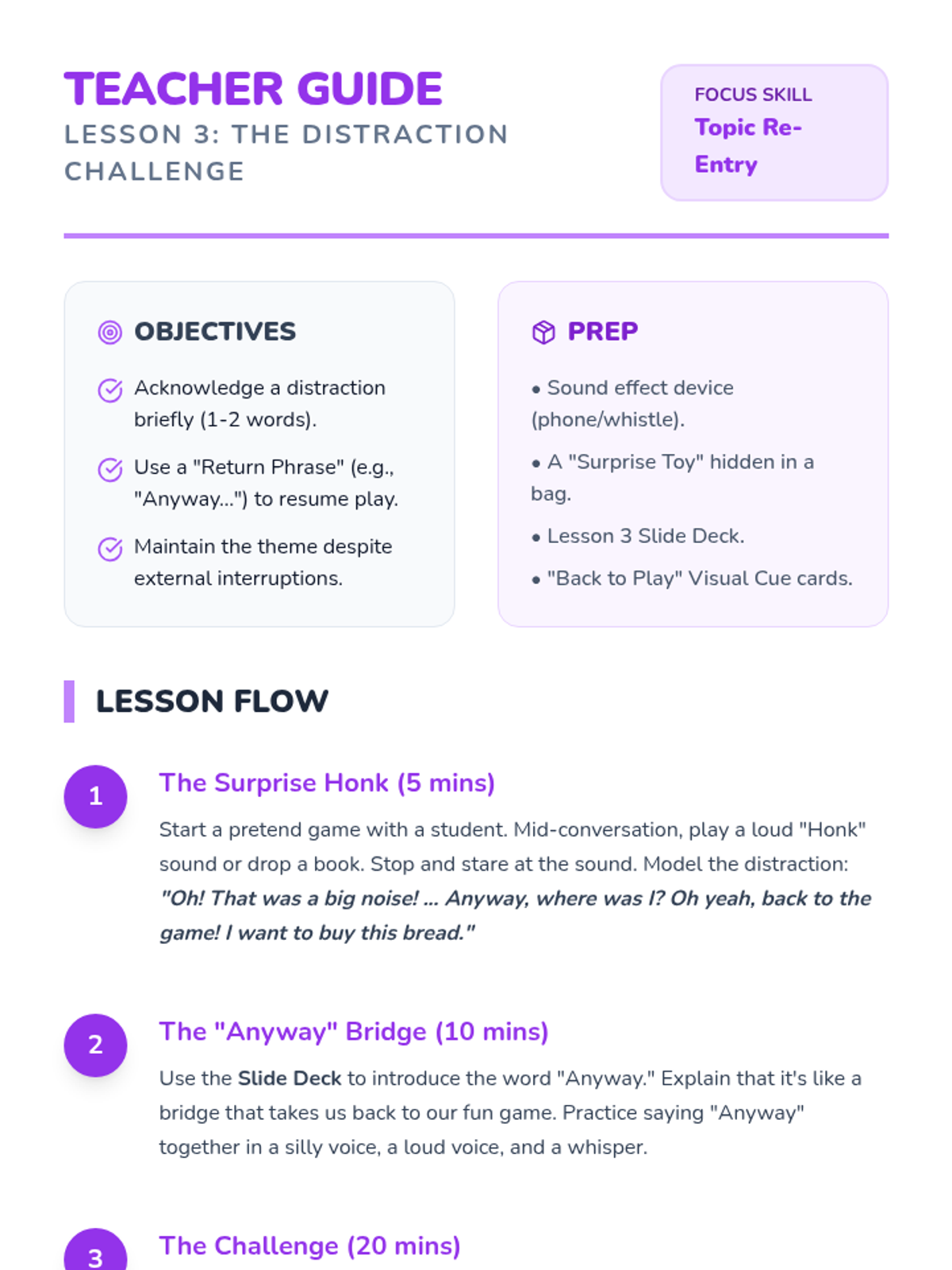 During a structured play scenario, the teacher introduces a 'distraction' (a new toy or noise). Students practice acknowledging the distraction briefly but then using a 'return phrase' (e.g., 'Anyway, back to the game') to resume their play theme.